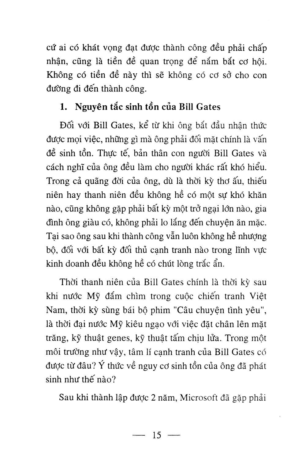 Đi lên từ bàn tay trắng, năm 20 tuổi, Bill Gates bắt đầu sự nghiệp của m.ình trong ngành công nghệ phần mềm. Năm 31 tuổi ông trở thành tỷ phú trẻ nhất trong lịch sử; năm 37 tuổi trở thành người giàu nhất nước Mỹ, đồng thời nhận được giải thưởng khoa học kỹ thuật quốc gia; năm 39 tuổi trở thành người giàu nhất thế giới. Sau khi có mặt trên thị trường cổ phiếu, Microsoft đã trở thành công ty có giá trị cao nhất trên thị trường toàn cầu; lợi nhuận thu được mỗi năm vượt qua tổng số lợi nhuận của 49 công ty phần mềm trong số 50 công ty phần mềm trên thế giới. Bill Gates đã khiến mọi người trên thế giới, đặc biệt là tầng lớp thanh thiếu niên, kính nể và ngưỡng mộ. Bill Gates có thể thu hút được sự quan tâm của mọi người như vậy, nguyên nhân không chỉ nằm ở số tài sản của ông.