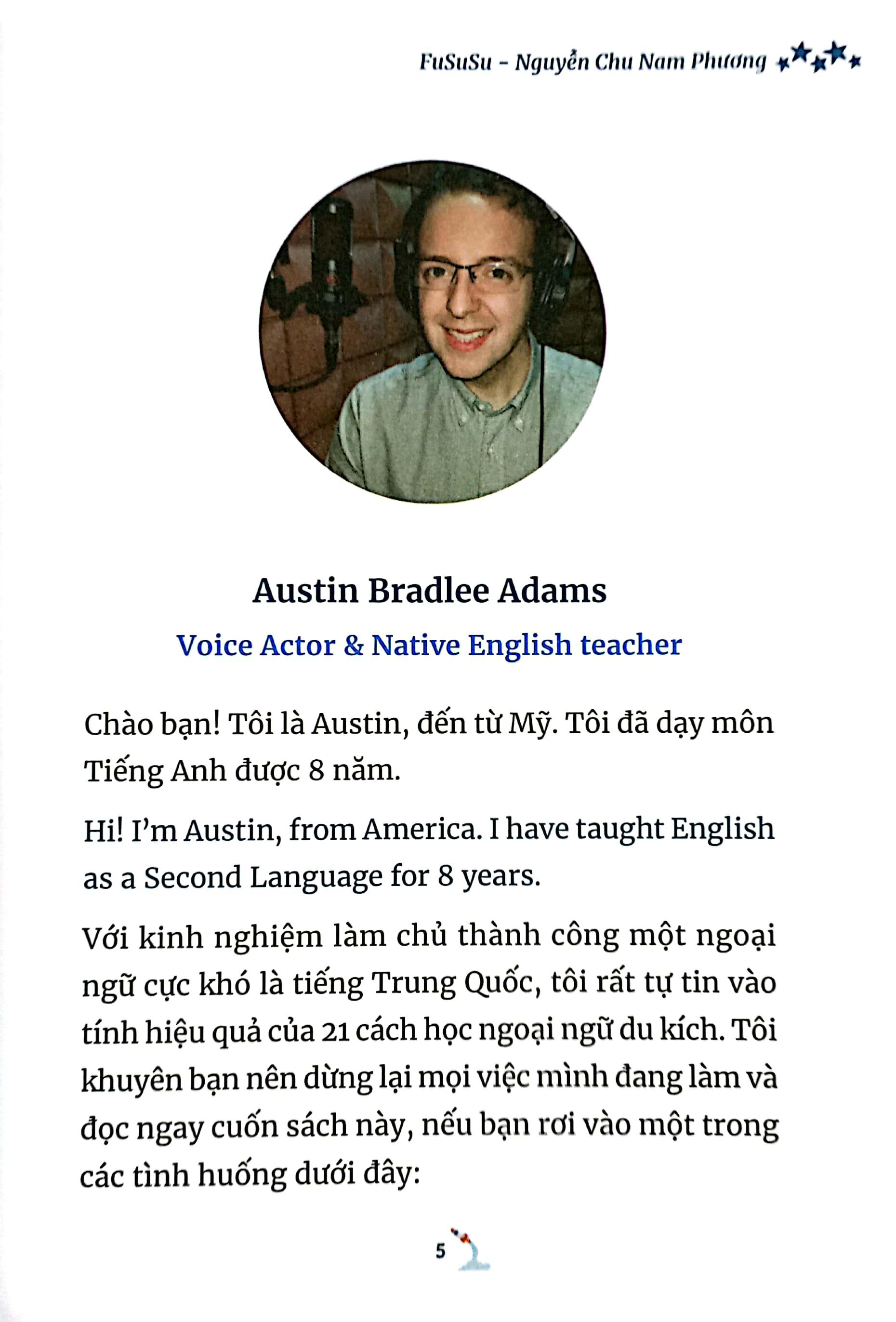 - Tự tin sử dụng tiếng Anh như một công cụ giúp bạn chinh phục mục tiêu, thăng tiến nhanh chóng. Hãy sở hữu ngay một cuốn 21 cách học tiếng Anh du kích, và bắt đầu hành trình biến tiếng Anh thành tiếng bố đẻ ngay từ hôm nay. Fususu là bút danh của Nguyễn Chu Nam Phương. Từng phải học lại tiếng Anh vỡ lòng, nhưng đã dịch hơn 6 cuốn sách của m.ình sang tiếng Anh, trong đó có 1 cuốn tiểu thuyết 100.000 chữ! Sợ phát âm sai, nhưng lại có thể đạt chức vô địch thuyết trình hài hước Toastmasters khu vực 5 nước Đông Nam Á (bằng tiếng Anh). Ngại giao tiếp, nhưng lại sáng lập CLB thuyết trình tiếng Anh ACI Toastmasters Online, giúp mọi người tự tin giao tiếp và thuyết trình tiếng Anh. Được công nhận là World Class Speaking Coach (Nhà Huấn Luyện Diễn Giả Quốc Tế) bởi nhà vô địch thuyết trình thế giới Craig Valentine. Điều đã giúp Nguyễn Chu Nam Phương thay đổi là niềm tin: Mọi thứ đều có thể, vấn đề là phương pháp. Có thể nói anh đã tìm ra con đường làm chủ tiếng Anh dễ dàng, hiệu quả.