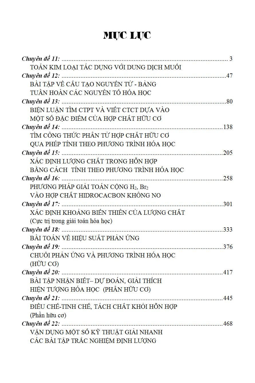 - Tập 1 (vô cơ): gồm 10 chuyên đề hóa học vô cơ vừa căn bản vừa chuyên sâu với những bài tập hay, khó, phương pháp giải hay và sáng tạo. Ở tập này, chúng tôi còn giới thiệu một số bài viết hay được đăng trên Tạp Chí Hóa học và Ứng dụng trong năm 2015.