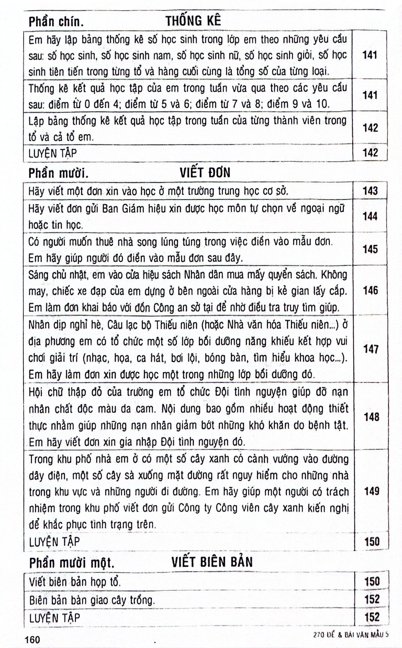 Các đề và bài văn trong sách được sắp xếp theo kiểu bài Tập làm văn, bắt đầu từ yêu cầu tập làm văn đơn giản là nói (đối với lớp 2, 3) và kể (đối với lớp 4, 5). Tiếp theo là các yêu cầu tập làm văn khó hơn (kể, gọi điện, viết, lập danh sách, mục lục, lập thời gian biểu, đặt câu theo mẫu đối với lớp 2; kể, giới thiệu hoạt động, viết lại bản tin, thuật lại ý kiến, điện báo, ghi chép sổ tay, thông báo, viết đơn, viết giấy mời, viết thư, báo cáo hoạt động, tập tổ chức cuộc họp đối với lớp 3, trao đổi, giới thiệu, viết thự, miêu tả đối với lớp 4 và miêu tả, thống kê, đơn từ, biên bản, thuyết trình – tranh luận và lập chương trình hoạt động đối với lớp 5).