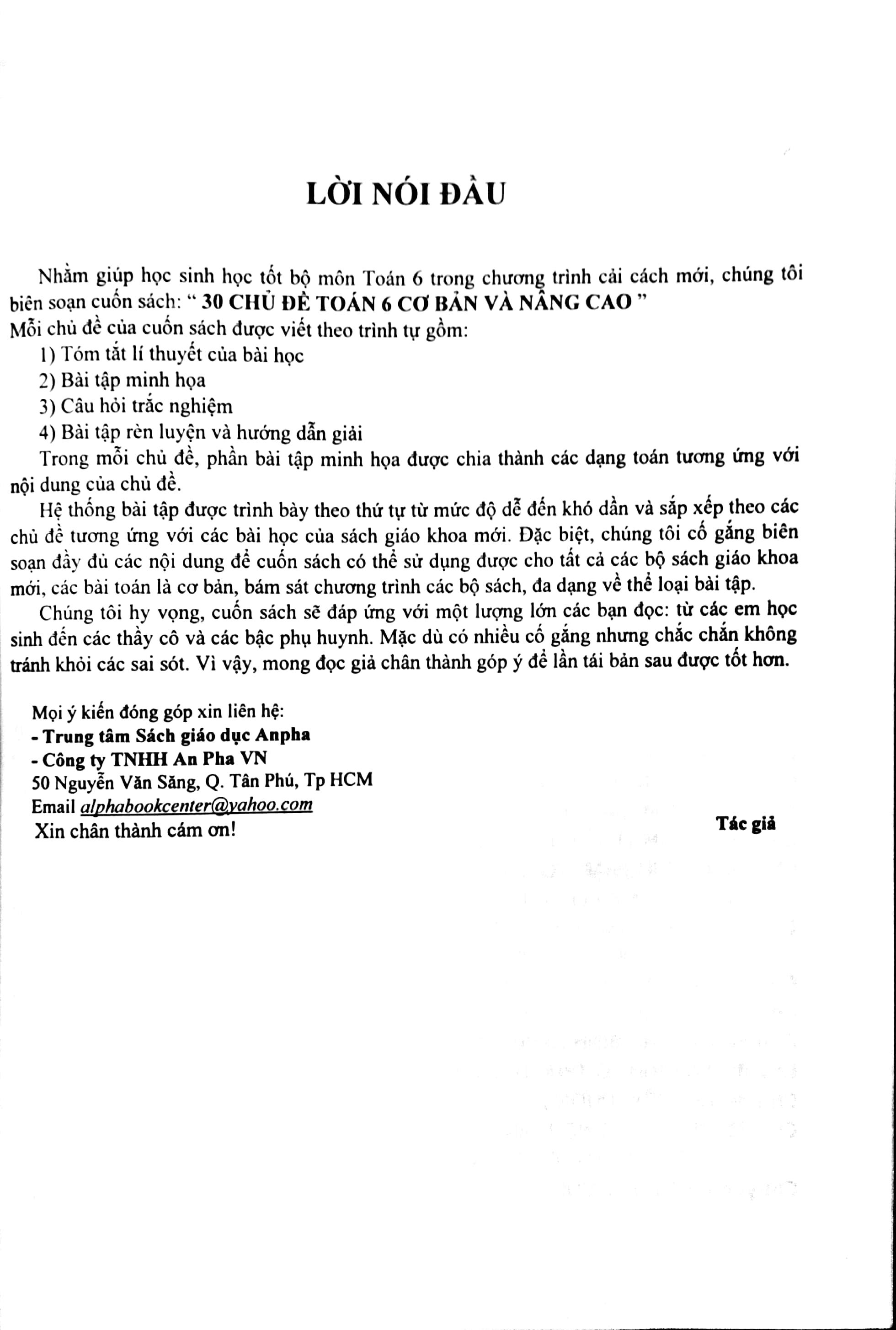 30 Chủ Đề Toán 6 - Cơ Bản Và Nâng Cao (Dùng Chung Cho 3 Bộ Sách) Nhằm giúp học sinh học tốt bộ môn Toán 6 trong chương trình cải cách mới, chúng tôi biên soạn cuốn sách: “ 30 CHỦ ĐỀ TOÁN 6 CƠ BẢN VÀ N NG CAO” Mỗi chủ đề của cuốn sách được viết theo trình tự gồm: