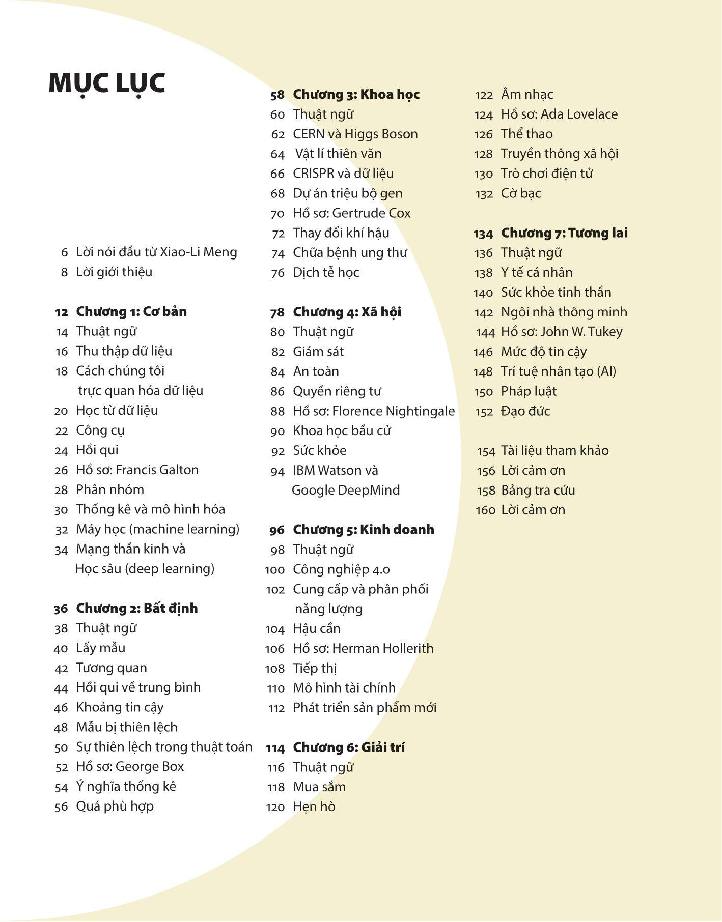 30 Giây Khoa Học - 30 Giây Khoa Học Dữ Liệu Khoa học dữ liệu (Data science) là một hệ sinh thái nhân tạo mới trong kỉ nguyên thông tin hiện đại, bao gồm từ việc tìm ra tội phạm đến dự đoán dịch bệnh. Nhưng bạn có biết rằng nó không phải chỉ là lượng thông tin khổng lồ được thu thập bởi máy tính, điện thoại thông minh và thẻ tín dụng? 30 Giây Khoa học dữ liệu bao gồm các nguyên tắc thống kê cơ bản thúc đẩy các thuật toán và cách thức dữ liệu ảnh hưởng đến chúng ta trong mọi lĩnh vực khoa học, xã hội, kinh doanh, giải trí - cùng với các vấn đề đạo đức và lời hứa về một thế giới tốt đẹp hơn trong tương lai. Mỗi đoạn văn 30 giây trình bày chi tiết một khía cạnh của khoa học dữ liệu chỉ trong khoảng 300 từ và một hình minh họa, miêu tả làm thế nào để thu thập các loại dữ liệu khác nhau và sử dụng các chương trình máy tính để tìm ra các qui luật mà mắt người không thể phát hiện ra, góp phần làm thay đổi thế giới. Tìm hiểu những ý tưởng và tiểu sử của những vĩ nhân đằng sau chúng, 30 giây Khoa học dữ liệu là cách nhanh nhất để khám phá cách dữ liệu ảnh hưởng mạnh mẽ đến các vấn đề lớn như biến đổi khí hậu, chăm sóc sức khỏe và cả những chi tiết nhỏ trong cuộc sống hàng ngày của chúng ta. Liberty Vittert là Giáo sư Khoa học Dữ liệu tại Trường Olin Business thuộc Đại học Washington, St Louis. Với tư cách là đại sứ của Hiệp hội Thống kê Hoàng gia, nữ chuyên gia của BBC và là thành viên được bầu chọn của Viện Thống kê Quốc tế, Liberty làm việc hết m.ình để phổ cập Khoa học thống kê và dữ liệu đến cho công chúng. Cô cũng là Phó biên tập cho Tạp chí Harvard Data Science Review và là thành viên Hoa Kì trong Hội đồng quản trị của Tổ chức Người tị nạn Liên hợp quốc (UNHCR).