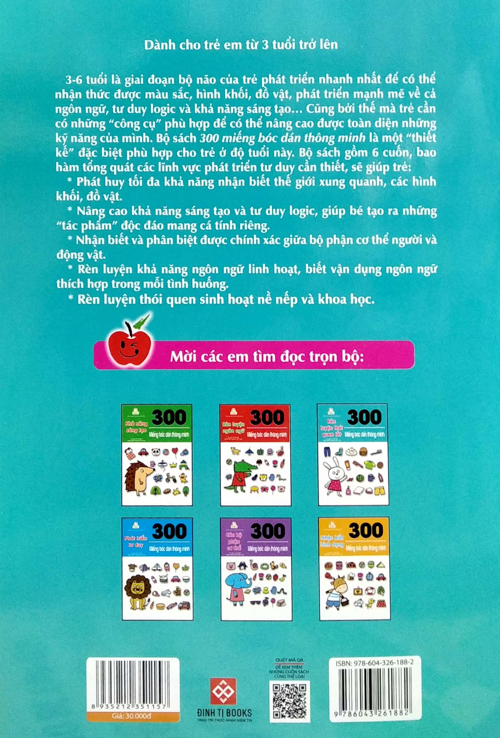 3-6 tuổi là giai đoạn bộ não của trẻ phát triển nhanh nhất để có thể nhận thức được màu sắc, hình khối, đồ vật, phát triển mạnh mẽ về cả ngôn ngữ, tư duy logic và khả năng sáng tạ Cũng bởi thế mà trẻ cần có những "công cụ" phù hợp để có thể nâng cao được toàn diện những kỹ năng của mình. Bộ sách 300 miếng bóc dán thông minh là một "thiết kế" đặc biệt phù hợp cho trẻ ở độ tuổi này. Bộ sách gồm 6 cuốn, bao hàm tổng quát các lĩnh vực phát triển tư duy cần thiết, sẽ giúp trẻ:
