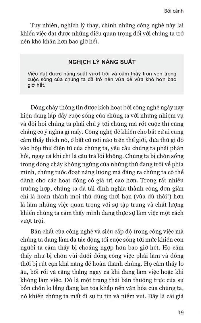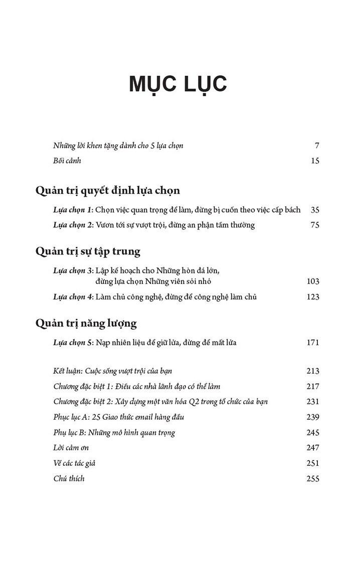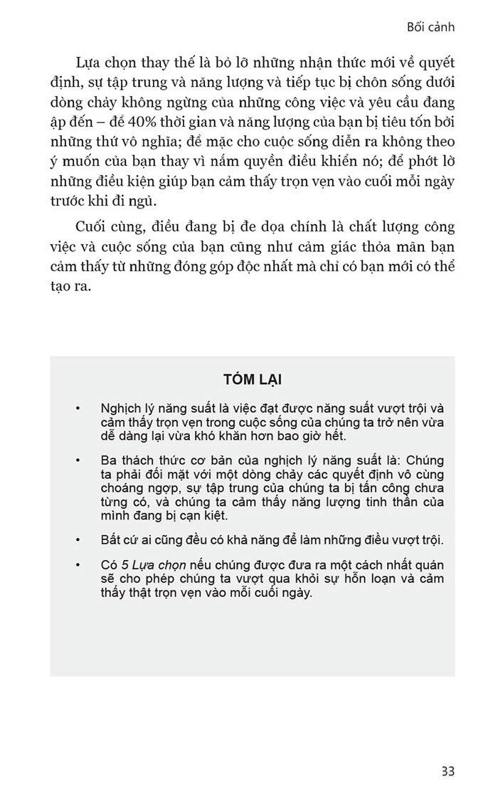 Mục đích của cuốn sách "5 Lựa Chọn Cho Năng Suất Vượt Trội" là để giúp bạn thoát ra khỏi ngọn núi đó, hít thở không khí trong lành thật sâu, và giành lại cuộc sống của mình. Chúng tôi sẽ giúp bạn tìm thấy đường ra bằng cách cung cấp cho bạn những nguyên lý, quy trình và công cụ để bạn có thể xoay chuyển tình thế - vượt qua sự chuyên chế của dòng chảy công việc vô tận không ngừng ập tới. Đây không phải là những công thức ma thuật có tác dụng tức thì. Chúng đòi hỏi nhiều nỗ lực, mỗi chương chứa đựng rất nhiều điều đơn giản nhưng đầy uy lực mà bạn có thể áp dụng ngay lập tức và tạo ra tác động đáng kể đến cuộc sống của bạn.