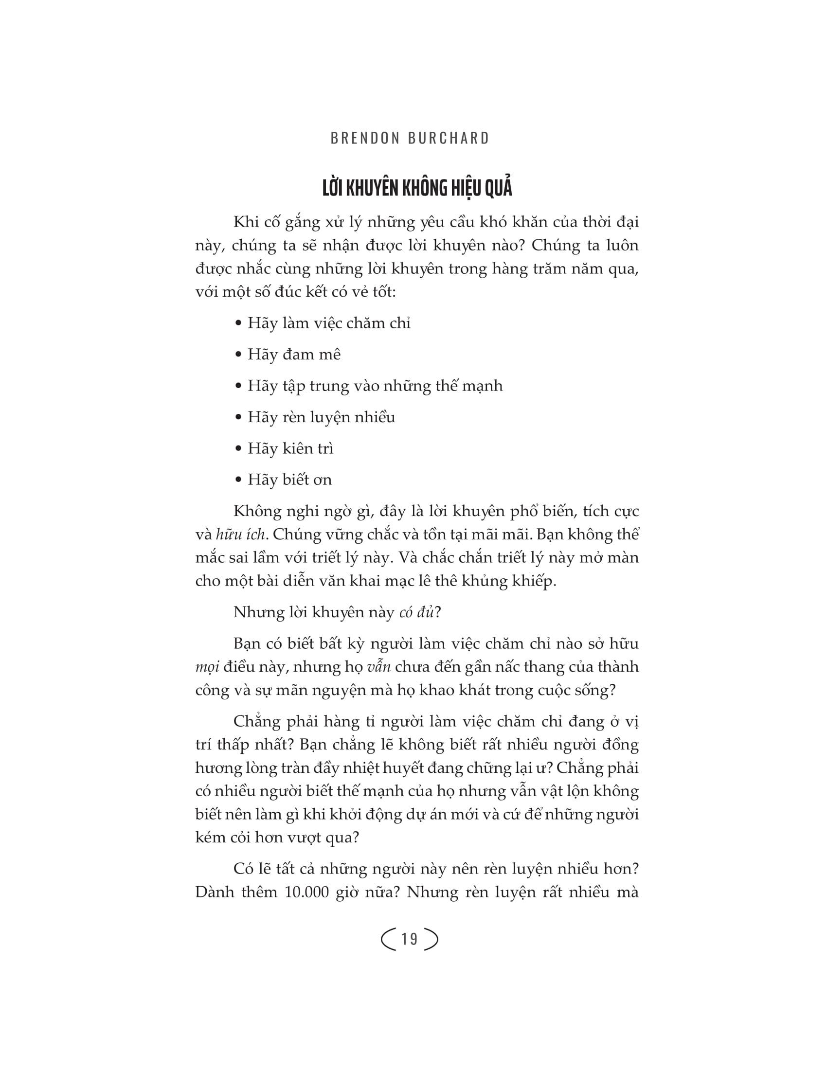- Thể hiện lòng can đảm Cuốn sách “High performance habits – 6 thói quen của người làm việc hiệu suất cao” diễn giải chi tiết cách thức để thực hành những thói quen này. Cuốn sách đã tổng hợp những nghiên cứu trong 20 năm của tác giả Brendon Burchard từ hoạt động huấn luyện của mình. Đây là các tổng kết đắt giá nhất có được nhờ các cuộc khảo sát, phỏng vấn tiêu chuẩn và các công cụ đánh giá chuyên nghiệp về những người có hiệu suất cao trên toàn thế giới. Tác phẩm hé lộ một người nên nắm bắt điều gì để trở thành một người hiệu suất cao – có thể tạo ra những cấp độ ngày càng tăng của hạnh phúc, sức khỏe và thành công lâu dài. Nếu bạn muốn hình thành một thói quen nào mới để thành công nhanh hơn, hãy chọn những thói quen trong cuốn sách này. Bất cứ ai cũng có thể thực hành chúng, và bạn sẽ thấy những điều phi thường xảy ra trong cuộc sống, các mối quan hệ và sự nghiệp. Nếu bạn muốn đạt được nhiều thứ hơn, lãnh đạo tốt hơn, phát triển kĩ năng nhanh hơn, hoặc đạt được nhiều niềm vui và tự tin hơn, “High performance habits – 6 thói quen của người làm việc hiệu suất cao” sẽ trợ giúp đắc lực cho bạn.