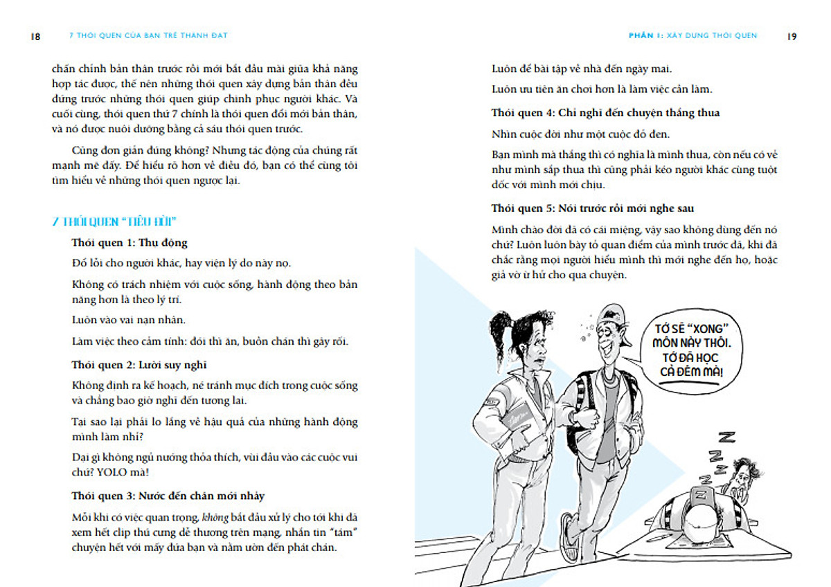 Cuốn sách phân tích tác động lớn lao của 7 thói quen quan trọng nhất của những bạn trẻ cần có. Đó là: Có thái độ sống tích cực; Biết định hướng tương lai; Việc hôm nay không để ngày mai; Tư duy cùng thắng; Biết lắng nghe để thấu hiểu và để được thấu hiểu; Có tinh thần hợp tác; Biết rèn luyện và phát triển những kỹ năng. Đây là những thói quen để các bạn tự rèn luyện bản thân và xây dựng các mối quan hệ của mình. Các thói quen này bổ sung và hỗ trợ chặt chẽ cho nhau, tạo một mắt xích bền vững giúp các bạn chọn lựa được hướng đi đúng đắn cho cuộc đời mình.