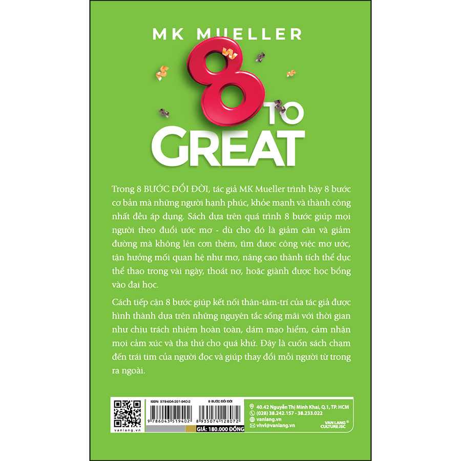 Trong 8 BƯỚC ĐỔI ĐỜI, tác giả MK Mueller trình bày 8 bước cơ bản mà những người hạnh phúc, khỏe mạnh và thành công nhất đều áp dụng. Sách dựa trên quá trình 8 bước giúp mọi người theo đuổi ước mơ - dù cho đó là giảm cân và giảm đường mà không lên cơn thèm, tìm được công việc mơ ước, tận hưởng mối quan hệ như mơ, nâng cao thành tích thể dục thể thao trong vài ngày, thoát nợ, hoặc giành được học bổng vào đại học. Cách tiếp cận 8 bước giúp kết nối thân-tâm-trí của tác giả được hình thành dựa trên những nguyên tắc sống mãi với thời gian như chịu trách nhiệm hoàn toàn, dám mạo hiểm, cảm nhận mọi cảm xúc và tha thứ cho quá khứ. Đây là cuốn sách chạm đến trái tim của người đọc và giúp thay đổi mỗi người từ trong ra ngoài.
