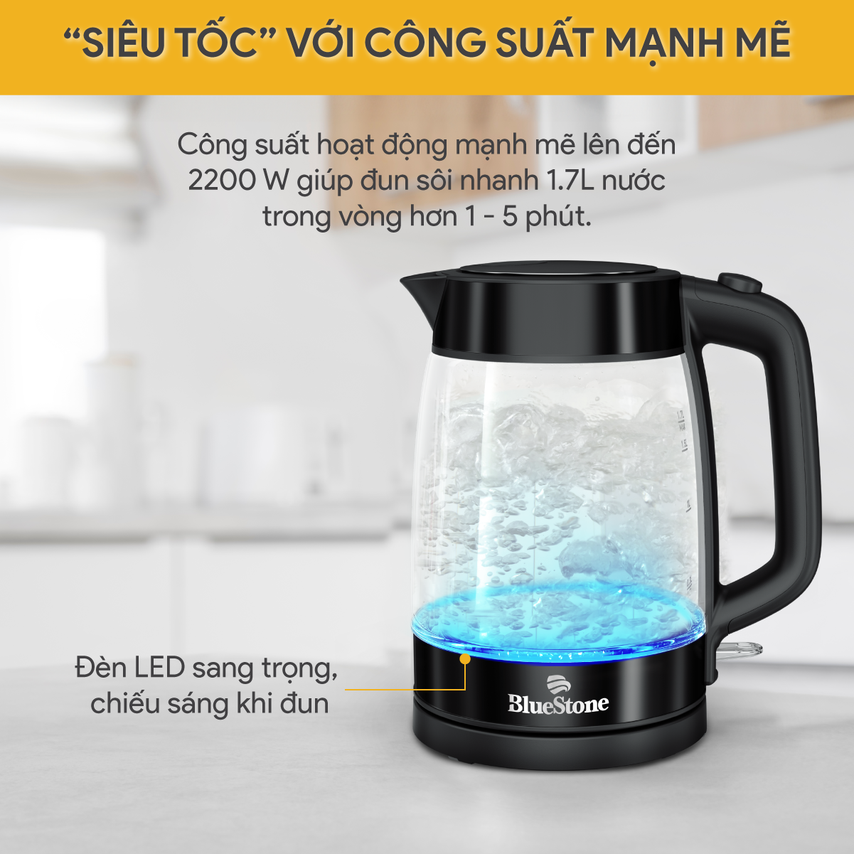 ✨Ấm Đun Thủy Tinh BlueStone KTB-3428 - 1.7 Lít - 1850-2200W - Bộ Điều Khiển: Strix - Bảo Hành 2 Năm - Hàng Chính Hãng