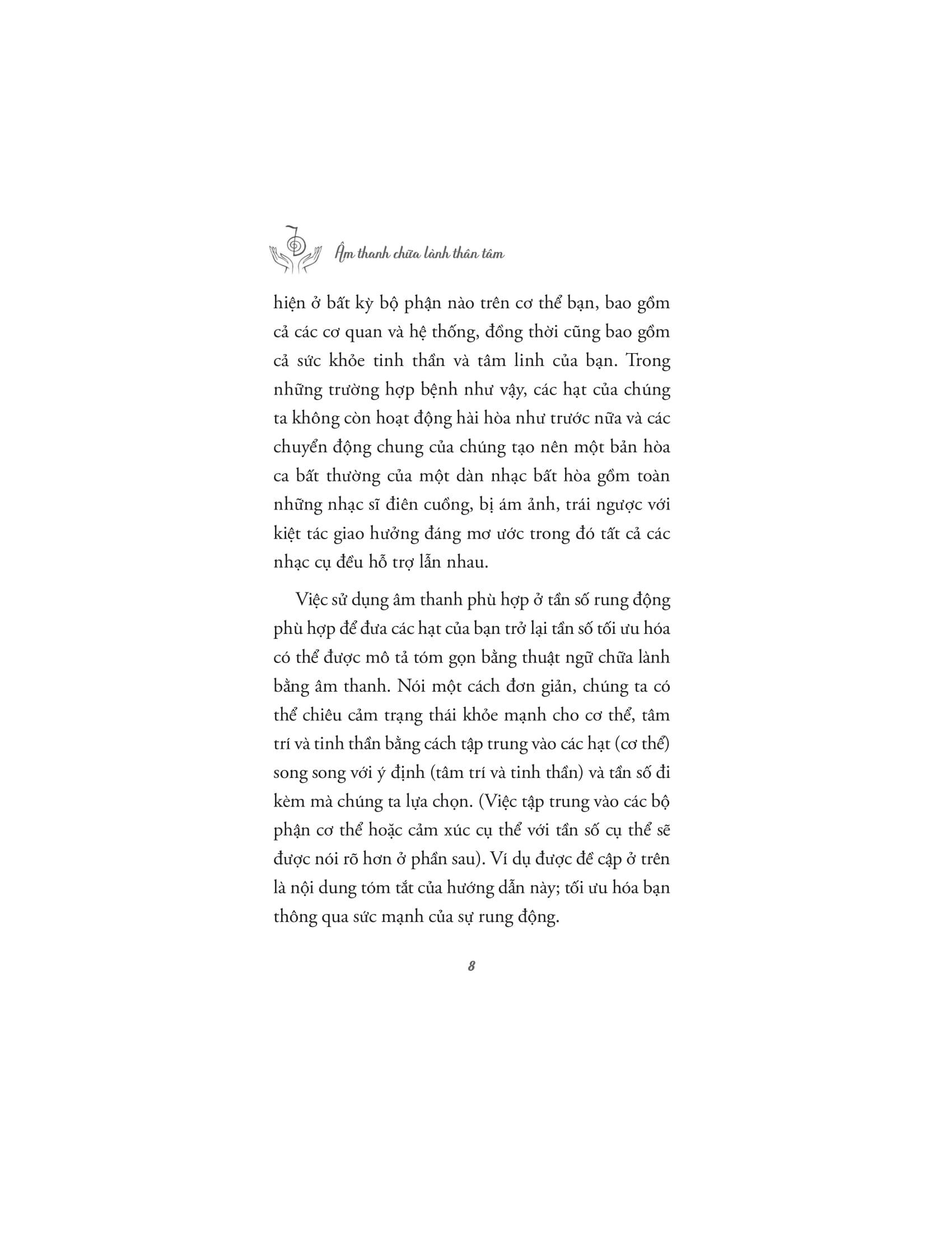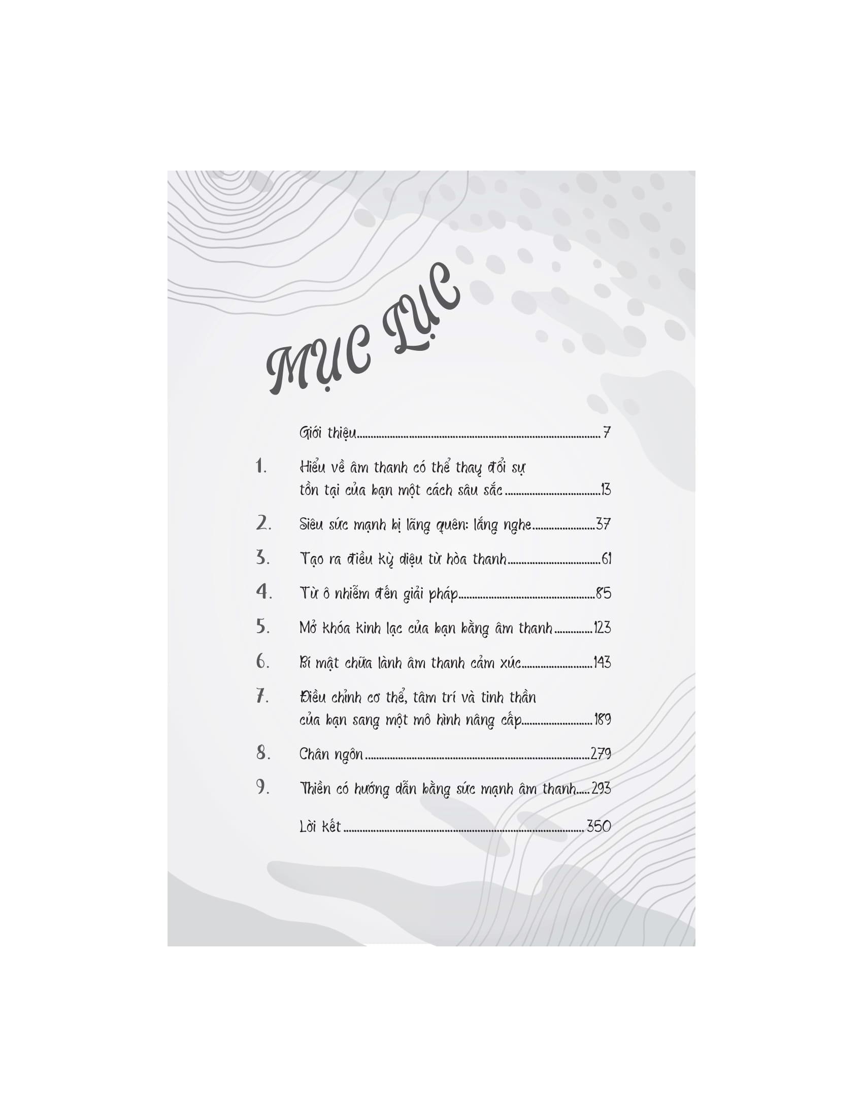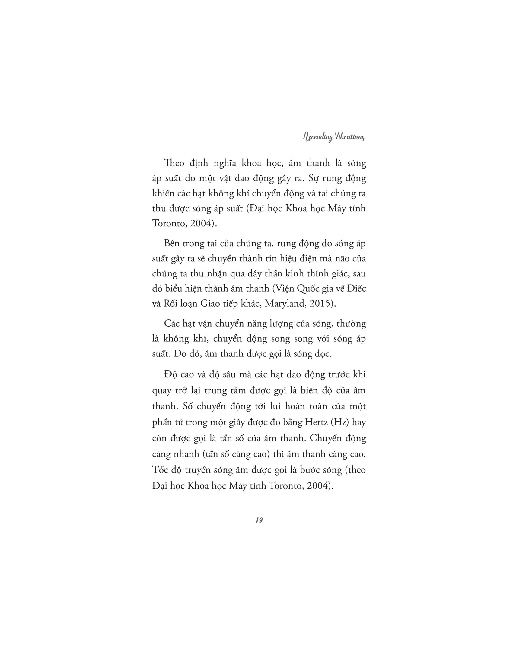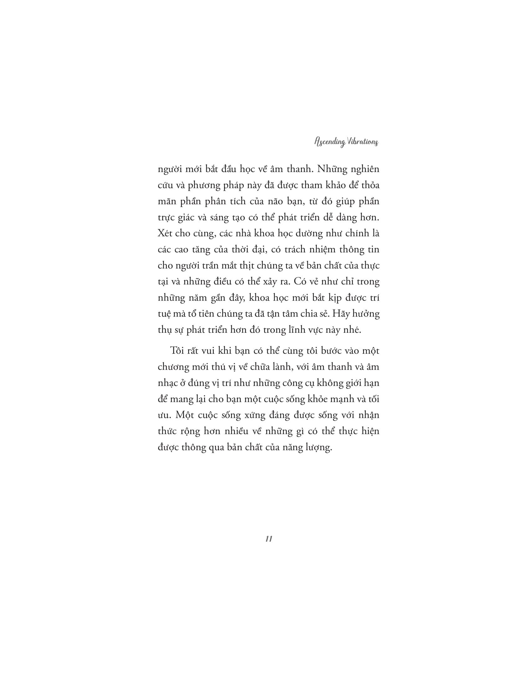 Âm Thanh Chữa Lành Thân Tâm Với nhịp sống hối hả hiện nay, mức độ căng thẳng ngày càng tăng khiến cơ thể và tâm trí bạn mệt mỏi. Âm nhạc và phương pháp trị liệu bằng âm thanh trở thành một trong số những phương pháp then chốt trong việc đ.iều trị tâm lý. Một trong những tác động đáng chú ý nhất của âm thanh và âm nhạc là khả năng ảnh hưởng đến tâm trạng. Một số âm thanh hoặc bản nhạc có thể khơi gợi những cảm xúc cụ thể như hạnh phúc, nỗi buồn hoặc nỗi nhớ. Ví dụ, nghe nhạc sôi động và lạc quan có thể tăng mức năng lượng, nâng cao cảm xúc tích cực và thúc đẩy cảm giác vui vẻ, nhiệt tình. Ngược lại, những giai điệu nhẹ nhàng, du dương có thể tạo bầu không khí yên tĩnh giúp chúng ta thư giãn, giảm căng thẳng. Cuốn sách "Âm Thanh Chữa Lành Thân Tâm" sẽ giúp bạn khai mở về sức mạnh của âm thanh trong việc chữa lành cả cơ thể lẫn tâm hồn. Cuốn sách tập trung vào việc giải thích cách mà âm thanh và các rung động có thể ảnh hưởng đến trạng thái năng lượng của con người, giúp xoa dịu căng thẳng, tái tạo năng lượng và kích hoạt các quá trình chữa lành tự nhiên từ bên trong. Tác giả dẫn dắt người đọc qua những ứng dụng khoa học, tâm linh và siêu hình của âm thanh, giải thích cách mà các liệu pháp âm thanh cổ xưa đã được sử dụng trong nhiều nền văn hóa khác nhau để chữa lành và cải thiện sức khỏe. Âm thanh không chỉ có khả năng tác động đến cảm xúc, mà còn có thể ảnh hưởng tích cực đến hệ thần kinh, hệ miễn dịch, và thậm chí là các luân xa, trung tâm năng lượng trong cơ thể con người. Với nhiều kỹ thuật và phương pháp trị liệu âm thanh khác nhau, những liệu pháp này giúp cơ thể thư giãn, giảm căng thẳng, loại bỏ tắc nghẽn năng lượng và khôi phục lại trạng thái cân bằng tự nhiên. Một trong những thông điệp quan trọng của cuốn sách là sự kết nối sâu sắc giữa con người và vũ trụ thông qua âm thanh. Các rung động âm thanh không chỉ giúp giải phóng những cảm xúc bị kìm nén, mà còn mở ra những con đường năng lượng, giúp con người tiếp cận những tần số cao hơn, mang lại sự bình an và nhận thức sâu sắc về sự hiện diện và vai trò của m.ình trong vũ trụ. "Âm thanh chữa lành thân tâm" là một cuốn sách không chỉ dành cho những người muốn tìm hiểu về âm nhạc và trị liệu, mà còn cho bất kỳ ai mong muốn khám phá sự kết nối giữa thân, tâm và vũ trụ thông qua các rung động của âm thanh. Về Tác giả: Ascending Vibrations là một nhóm xuất bản độc lập dành riêng cho những ai muốn mở rộng ý thức và nâng cao sự tồn tại của họ. Họ muốn mang đến sự gia tăng nhận thức có ý thức trong thế giới hiện đại với các tác phẩm sâu sắc và dễ hiểu về các yếu tố tâm linh cốt lõi như chánh niệm, tăng cường luân xa, bí mật chữa bệnh bằng âm thanh, kiến thức cổ xưa, kỹ thuật yoga, v.v.