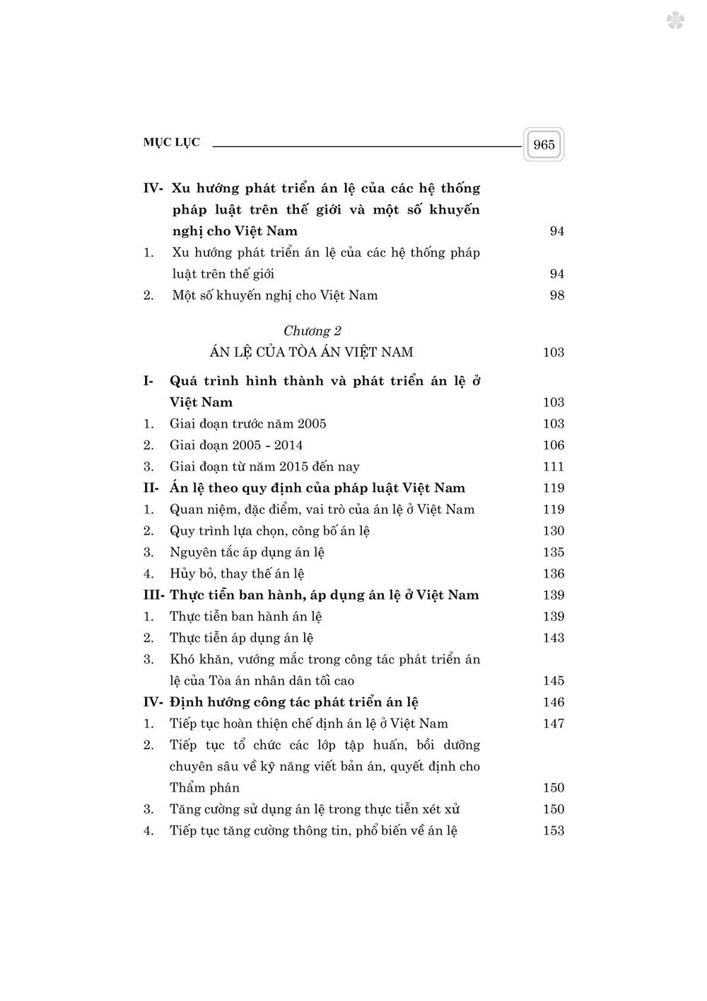 Trên cơ sở khái quát quá trình phát triển án lệ ở Việt Nam và kinh nghiệm xây dựng, áp dụng án lệ ở một số quốc gia trên thế giới, cuốn sách chuyên khảo