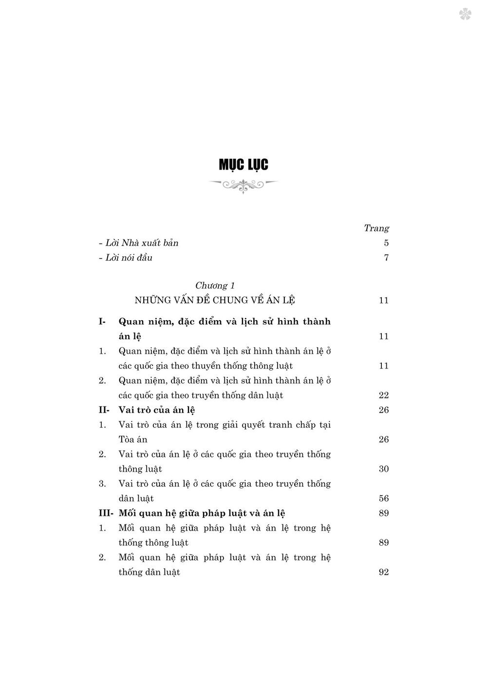 Trên cơ sở khái quát quá trình phát triển án lệ ở Việt Nam và kinh nghiệm xây dựng, áp dụng án lệ ở một số quốc gia trên thế giới, cuốn sách chuyên khảo Án lệ Việt Nam phân tích thực trạng áp dụng án lệ trong thực tiễn xét xử và khuyến nghị một số giải pháp nhằm nâng cao chất lượng quá trình nghiên cứu, đề xuất, công bố và áp dụng án lệ. Ngoài 3 chương chính, phần phụ lục của cuốn sách giới thiệu toàn văn 72 án lệ đã được công bố và phát triển từ các bản án, quyết định của Tòa án nhân dân các cấp.