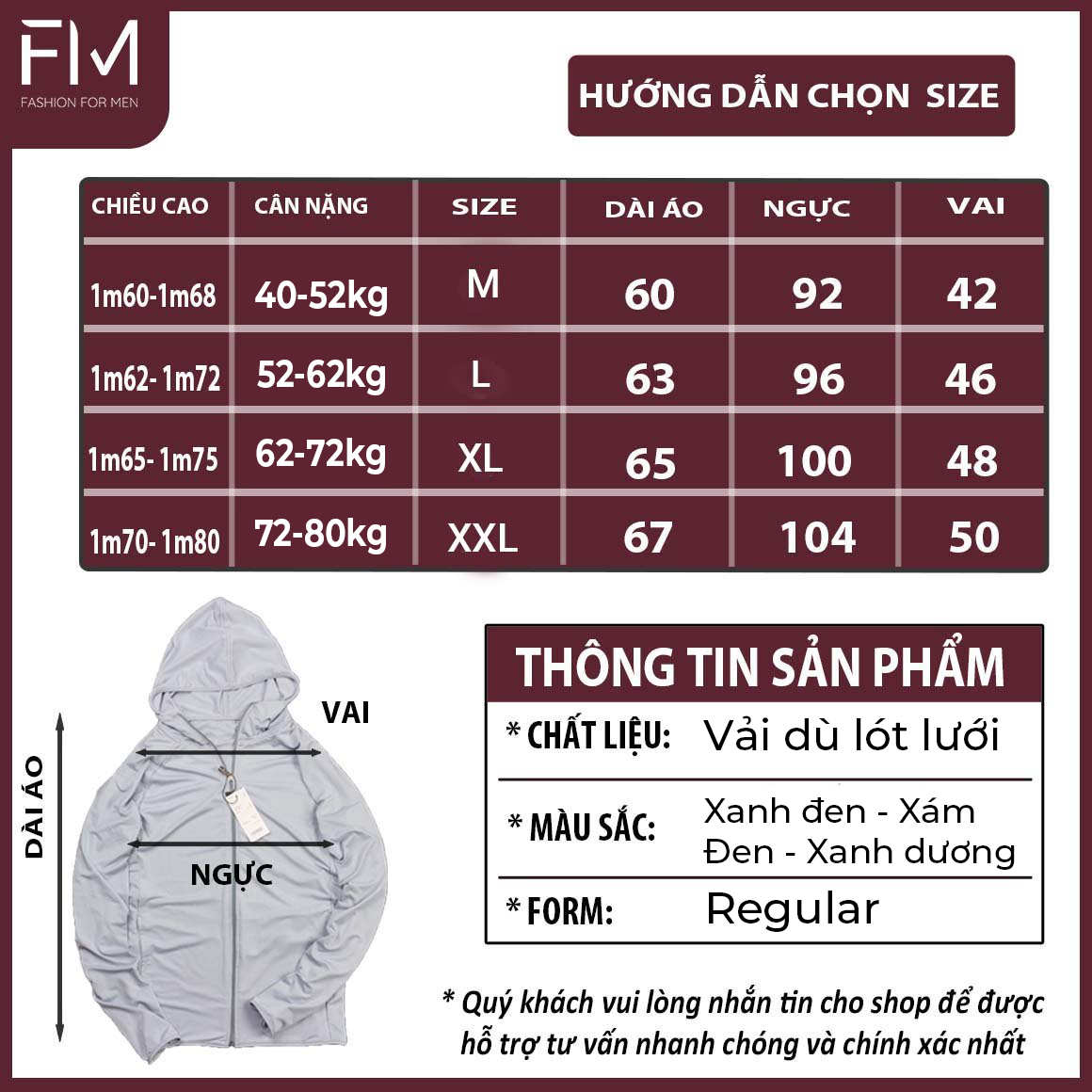 Chất liệu dù cao cấp 2 lớp chống nắng và chống nước 2 màu như hình, khách có thể mặc đc 2 lớp xanh và đen Size L 50-65kg Size XL 65-75kg Size XXL từ
