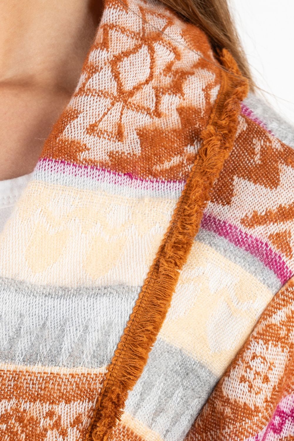 Áo Khoác Isla Bonita, kiểu áo choàng thu đông, không nút cài, họa tiết thổ cẩm độc đáo. Chất vải giống vải bố. Freestyle. Dài áo thân trước 70cm, thân sau 90cm. (50x90cm)Phù hợp đi
