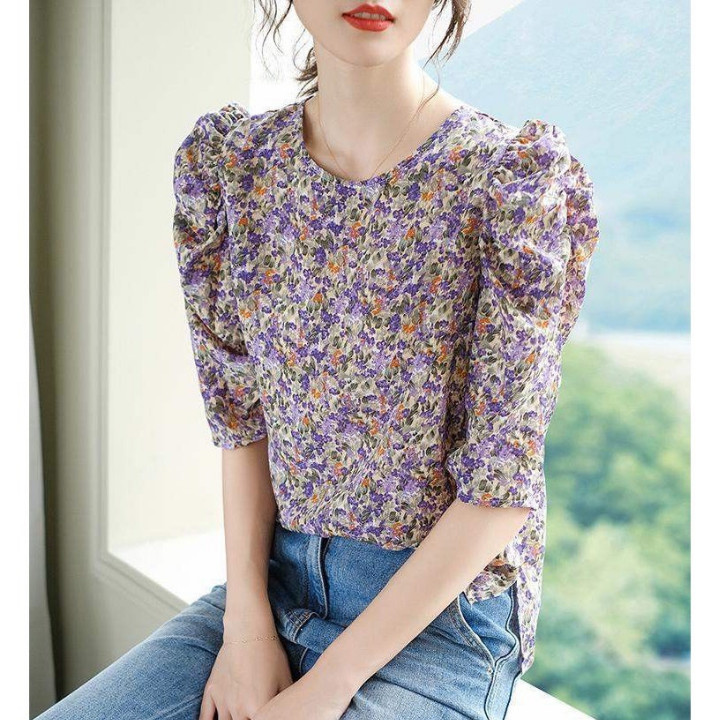 - Áo kiểu họa tiết hoa nhí tay phồng nhẹ sang trọng