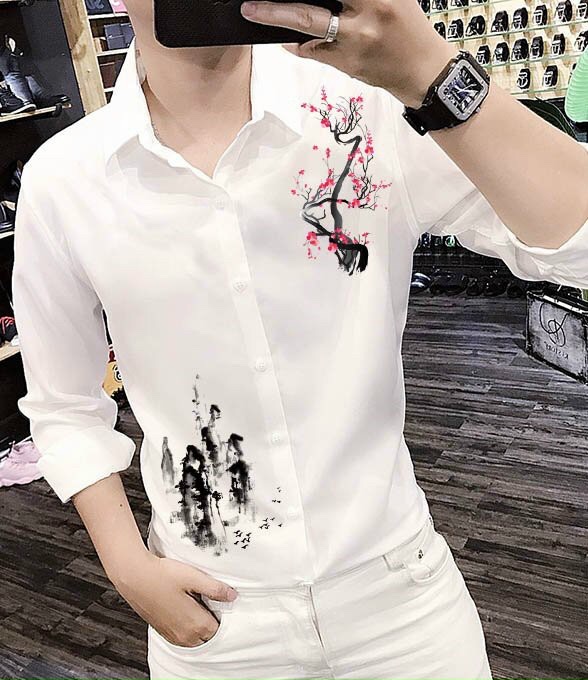 Thiết kế Áo sơ mi nam tay dài viền vai họa tiết cây hoa anh đào cao cấp phong cách đường may tỉ mỉ. Áo thiết kế form vừa vặn giúp tôn được đường nét
