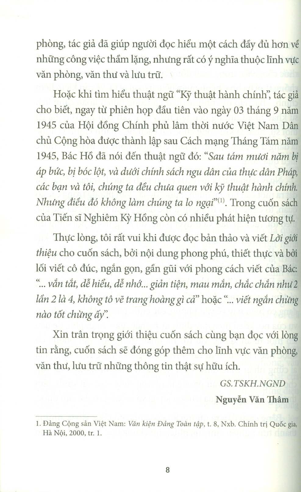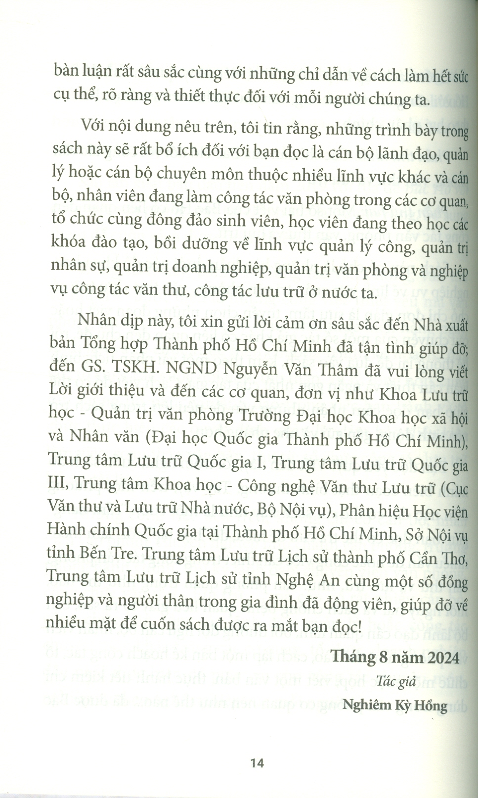 Phần thứ hai là tập hợp một số bài viết của Bác Hồ có liên quan đến công tác văn phòng, văn thư và lưu trữ như: óc tổ chức công việc trong hoạt động của Ủy ban nhân dân các cấp, về chống thói ba hoa, bệnh quan liêu, nạn giấy tờ, về cần kiệm liêm chính… Bác Hồ nói những điều đó trong nhiều hoàn cảnh lịch sử khác nhau nhưng đến tận ngày nay vẫn còn nguyên giá trị thời sự, nhất là khi công cuộc cải cách nền hành chính ở nước ta đang được đẩy mạnh để làm cho hoạt động quản lý nhà nước hiệu quả hơn. Bằng cách dẫn ra những lời nhắc nhở của Bác Hồ và những thành tựu nghiên cứu của nhiều nhà khoa học về công việc văn phòng, tác giả đã giúp người đọc hiểu một cách đầy đủ hơn về những công việc thầm lặng, nhưng rất có ý nghĩa thuộc lĩnh vực văn phòng, văn thư và lưu trữ.