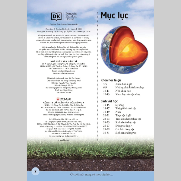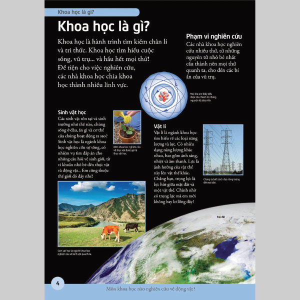 Với các hình minh họa trực quan sinh động, bắt mắt, cuốn sách cung cấp một lượng kiến thức phong phú, súc tích, dễ hiểu, cùng những câu hỏi vui, mẩu thông tin thú vị về khoa học. Em sẽ được tìm hiểu từng lĩnh vực mà khoa học nghiên cứu, từ sinh vật học, hóa học, vật lí tới thiên văn học. Bên cạnh đó, em có thể tìm trong cuốn sách các hướng dẫn và gợi ý giúp em thử làm nhà khoa học nhí nữa đấy.