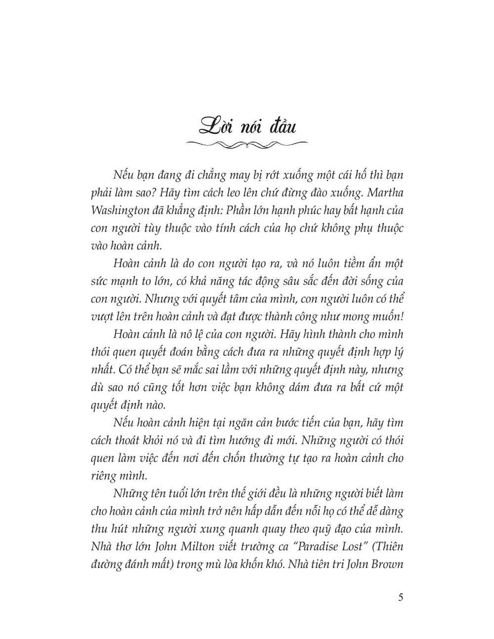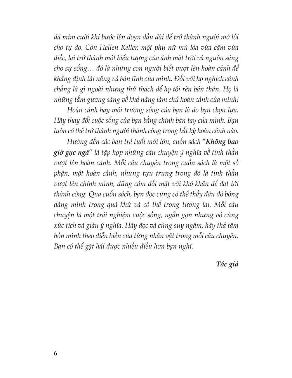 Tập hợp những câu chuyện ý nghĩa về tinh thần vượt lên hoàn cảnh. Mỗi câu chuyện là một số phận, một hoàn cảnh, một trải nghiệm cuộc sống, ngắn gọn nhưng vô cùng xúc tích và giàu ý nghĩa. “Hoàn cảnh hay môi trường sống của bạn là do bạn chọn lựa. Hãy thay đổi cuộc sống của bạn bằng chính bàn tay của mình. Bạn luôn có thể trở thành người thành công trong bất kỳ hoàn cảnh nào.”