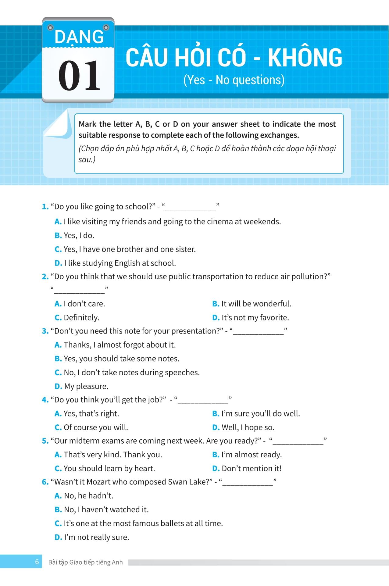 Với bài tập Giao tiếp Tiếng Anh trong kì thi vào 10 và 10 chuyên môn Tiếng Anh, cuốn sách phân chia làm 3 dạng bài: