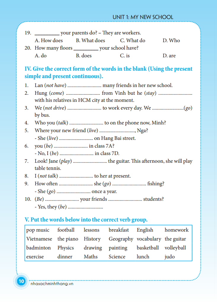 Bài Tập Tiếng Anh Lớp 6 (Không Đáp Án) (Sách Màu) Sách bài tập tiếng anh lớp 6 được biên soạn dành cho học sinh lớp 6, do Nhà xuất bản Đại học Quốc gia Hà Nội phát hành. Dựa vào phương pháp dạy ngôn ngữ giao tiếp (Communicative Language Teaching Method), sách tập trung vào việc phát triển các kỹ năng ngôn ngữ cho học sinh Trung học cơ sở thông qua các dạng bài bổ ích, trong đó tập trung vào luyện ngữ âm, từ vựng, kỹ năng đọc hiểu, kỹ năng viết và sử dụng ngôn ngữ tổng hợp thông qua các bài kiểm tra (Tests), giúp cho các em học sinh có thể tổng hợp kiến thức hiệu quả nhất.