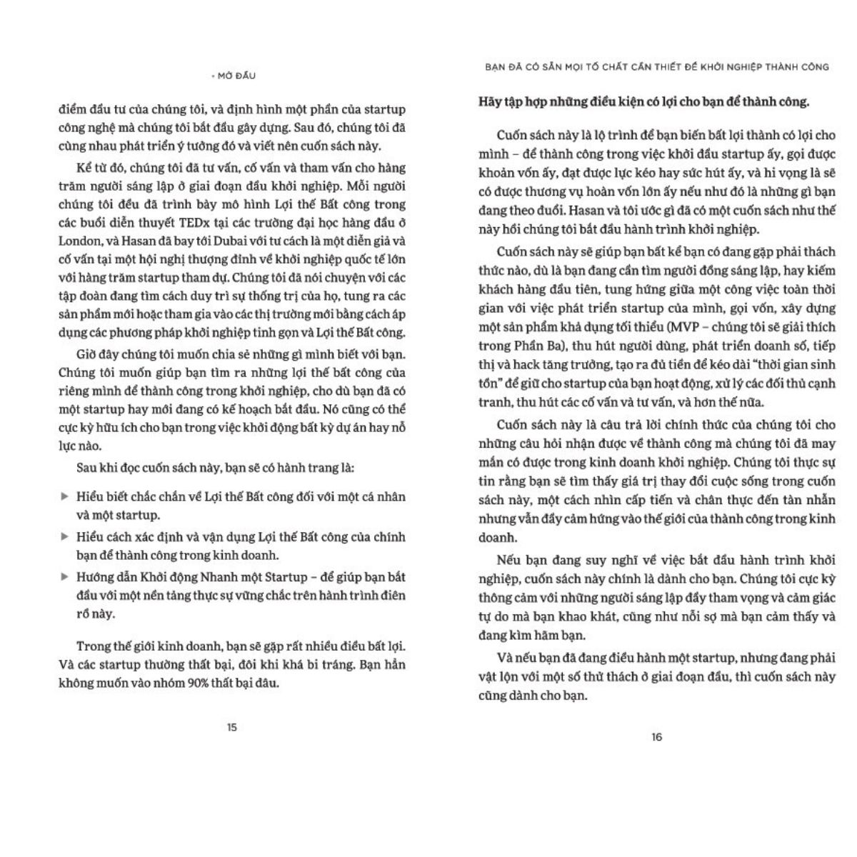 Bạn Đã Có Sẵn Mọi Tố Chất Cần Thiết Để Khởi Nghiệp Thành Công Đây là quyển sách đã giành giải thưởng Sách Kinh tế hay nhất năm 2021 của Vương quốc Anh. Đâu là sự khác biệt giữa một công ty khởi nghiệp thành công với một công ty thất bại đau thương? Đằng sau mỗi câu chuyện thành công là một lợi thế bất công. Nhưng lợi thế bất công không chỉ nằm ở chỗ bố mẹ bạn giàu có ra sao hay bạn quen biết nhân vật nào, ai cũng có thể có một lợi thế nào đó. Lợi thế bất công là yếu tố giúp bạn ưu việt hơn đối thủ. Cuốn sách đột phá này chỉ ra cách xác định Lợi thế Bất công của riêng bạn và vận dụng chúng vào bất kỳ dự án nào. Dựa trên hơn hai thập kỷ kinh nghiệm thực tiễn, bao gồm cả thời gian làm giám đốc tiếp thị đầu tiên cho Just Eat (một công ty khởi nghiệp hiện trị giá hơn 5 tỉ bảng Anh), các tác giả đưa ra một khuôn khổ độc đáo để đánh giá ngoại cảnh, bên cạnh sức mạnh nội tại của bạn. Cần cù và gan góc là chưa đủ, vì vậy họ khám phá cả tầm quan trọng của tiền bạc, trí tuệ, vị trí, học vấn, chuyên môn, vị thế và may mắn trong hành trình đi đến thành công. Từ việc thành lập công ty của riêng mình, đến việc đạt được sức hút, huy động vốn và tăng trưởng,  giúp bạn nhìn lại mình và tìm ra những yếu tố bạn vốn có nhưng bản thân chưa từng nhận ra, để thành công được trong thế giới kinh doanh khốc liệt.