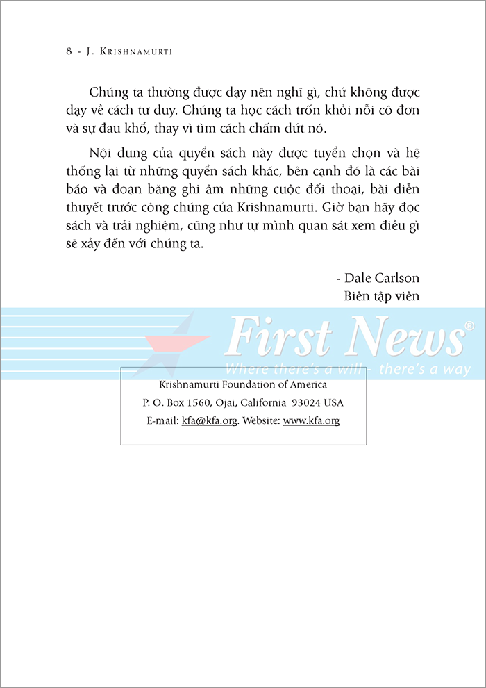 Bạn Đang Nghịch Gì Với Đời Mình Cách thức bạn và tôi liên hệ với bộ não, với mọi người, với tiền bạc, công việc, tình dục, … tất cả những mối quan hệ gần gũi này đều góp phần hình thành nên xã hội. Mối tương quan giữa chúng ta với chính mình, cũng như với hàng tỷ người khác tạo nên thế giới. Sự tập hợp những thiên kiến, nỗi cô đơn, những khát vọng tham lam, những cơn đói khát về thể xác hay về tinh thần, những nỗi giận và niềm đau trong mỗi chúng ta, tất cả cùng tạo dựng nên thế giới. Thế giới không cách biệt với chúng ta, thế giới chính là chúng ta. Nếu từng người trong chúng ta thay đổi thì cùng nhau, chúng ta thay đổi thế giới. Dù cho chỉ một người trong chúng ta thay đổi cũng đủ tạo nên gợn sóng lăn tăn, điều tốt đẹp vốn rất dễ lan truyền. Ở trường học, chúng ta được dạy rằng phải vâng lời cha mẹ và thầy cô, nghe thoáng qua điều này có vẻ hợp lý. Song, hàng ngàn thế hệ vẫn chưa hề học được, trên phương diện tâm lý, cách để chấm dứt đau khổ cho chính mình và ngừng gây đau khổ cho người khác. Quá trình phát triển tâm lý đã không bắt kịp quá trình tiến hóa sinh học hay phát triển khoa học. Ở trường, chúng ta đều học được cách kiếm sống; còn để lĩnh hội nghệ thuật sống thì chúng ta phải tự mình tìm hiểu lấy. Cuộc sống làm tổn thương tất cả chúng ta với sự cô đơn, bối rối, cảm giác thất bại, tuyệt vọng. Cuộc sống vùi dập chúng ta trong tình trạng nghèo đói, bệnh tật cảm xúc, bạo lực bủa vây từ trong nhà ra ngoài ngõ. Chúng ta được dạy dỗ nhiều điều, song rất ít trong số chúng có thể giúp được khi ta bị tổn thương, choáng ngợp trước cuộc sống. Một điều quan trọng mà chúng ta không được dạy, đó là không phải cuộc sống mà chính những phản ứng của ta trước những gì xảy ra mới là nguyên nhân dẫn đến đau khổ. Chính nỗi sợ bắt nguồn từ việc tự phòng vệ của ta đã khiến ta khổ sở. Bảo vệ cơ thể là phản xạ tự nhiên, nhưng liệu còn tự nhiên không khi ta bảo vệ cho cái tôi của mình, bảo vệ cho cái nguồn cơn gieo rắc rối, nỗi đau tâm lý mà chúng ta phải gánh chịu? Nếu bạn tìm cách trốn thoát khỏi nỗi đau tinh thần và sự rối loạn một cách hời hợt bằng việc sa đà vào matu.y và các thú tiêu khiển, tình d.ục, hoặc tìm cách khiến mình trở nên bận rộn, thì vấn đề vẫn còn nguyên, thêm vào đó là tình trạng kiệt sức và sự nghiện ngập. Hãy chú tâm đến những phương cách của cái tôi, và nhận thức rằng nỗi sợ hãi, ham muốn, hay cơn giận đều rất tự nhiên; bạn không nhất thiết phải thể hiện chúng ra ngoài hay phải có bằng được mọi thứ bạn muốn. Sự thấu thị này sẽ hóa giải nỗi thống khổ tinh thần, đồng thời tránh làm nó trở nên trầm trọng hơn. Chúng ta cần phải hiểu về bản ngã, nguồn cơn sinh ra những vấn đề của chúng ta; không phải theo kiểu chỉ biết mỗi mình, mà là để chú tâm vào những ý nghĩ, những cảm xúc và những hành vi của bản ngã, cùng với các khía cạnh sinh lý, cá nhân, giới tính và văn hóa của nó: đây chính là thiền định. Những mẩu hội thoại và những bài viết này được thực hiện bởi một người đàn ông sống theo cách của những người ngoài cuộc vĩ đại trong xã hội: kẻ nổi loạn, nhà thơ và nhà giáo lãng du, triết gia tôn giáo, người bài trừ thần tượng, nhà khoa học và nhà tâm lý học đột phá. Krishnamurti đã dành ra hơn 65 năm để diễn thuyết về tự do tâm lý cho bất kỳ ai muốn lắng nghe thông điệp của ông. Ông đã sáng lập các trường học dành cho trẻ em và thanh thiếu niên, nơi mà thiếu nhi và giới trẻ có thể học hỏi về mọi chủ đề, môn học thường thức cũng như về chính bản thân họ. Trong các bài giảng trên lớp và trong tất cả các bài nói chuyện, bài viết của mình, ông chỉ ra rằng không phải những cuộc đấu tranh nội tâm cũng như cuộc chiến bên ngoài sẽ giải phóng chúng ta, mà chính sự thật về bản thân chúng ta sẽ làm điều đó. Không tồn tại bất cứ lộ trình, uy quyền hay bậc thầy nào đưa đường dẫn lối: Bạn có khả năng nội tại để khám phá xem mình là ai, đang làm chi với đời mình và nhìn nhận các mối quan hệ, cùng công việc của bạn. Bạn phải thử trải nghiệm những điều được đề cập trong quyển sách này. Sự thật do một người khác chỉ ra cũng không khác gì một ý kiến, cho đến khi bạn tự mình trải nghiệm. Bạn phải soi rọi mình thật rõ ràng, hoặc bạn sẽ mắc kẹt với một đám bụi mịt mù của ngôn từ mà không thực sự nhận biết gì về cuộc sống. Chúng ta thường được dạy nên nghĩ gì, chứ không được dạy về cách tư duy. Chúng ta học cách trốn khỏi nỗi cô đơn và sự đau khổ, thay vì tìm cách chấm dứt nó. Nội dung của quyển sách này được tuyển chọn và hệ thống lại từ những quyển sách khác, bên cạnh đó là các bài báo và đoạn băng ghi âm những cuộc đối thoại, bài di