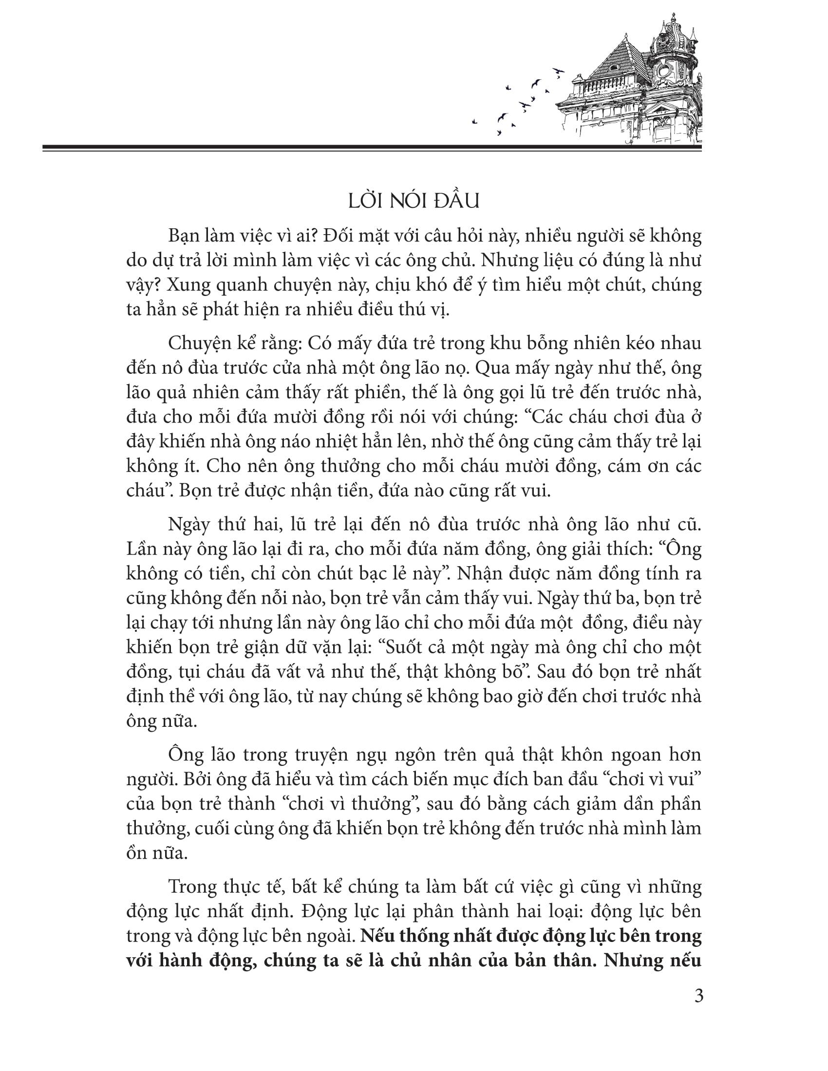 Trong thực tế, bất kể chúng ta làm bất cứ việc gì cũng vì những động lực nhất định. Động lực lại phân thành hai loại: động lực bên trong và động lực bên ngoài. Nếu thống nhất được động lực bên trong với hành động, chúng ta sẽ là chủ nhân của bản thân. Nhưng nếu việc làm được thúc đẩy bởi động lực bên ngoài thì sớm muộn chúng ta cũng khiến mình trở thành nô lệ cho những yếu tố bên ngoài đó.