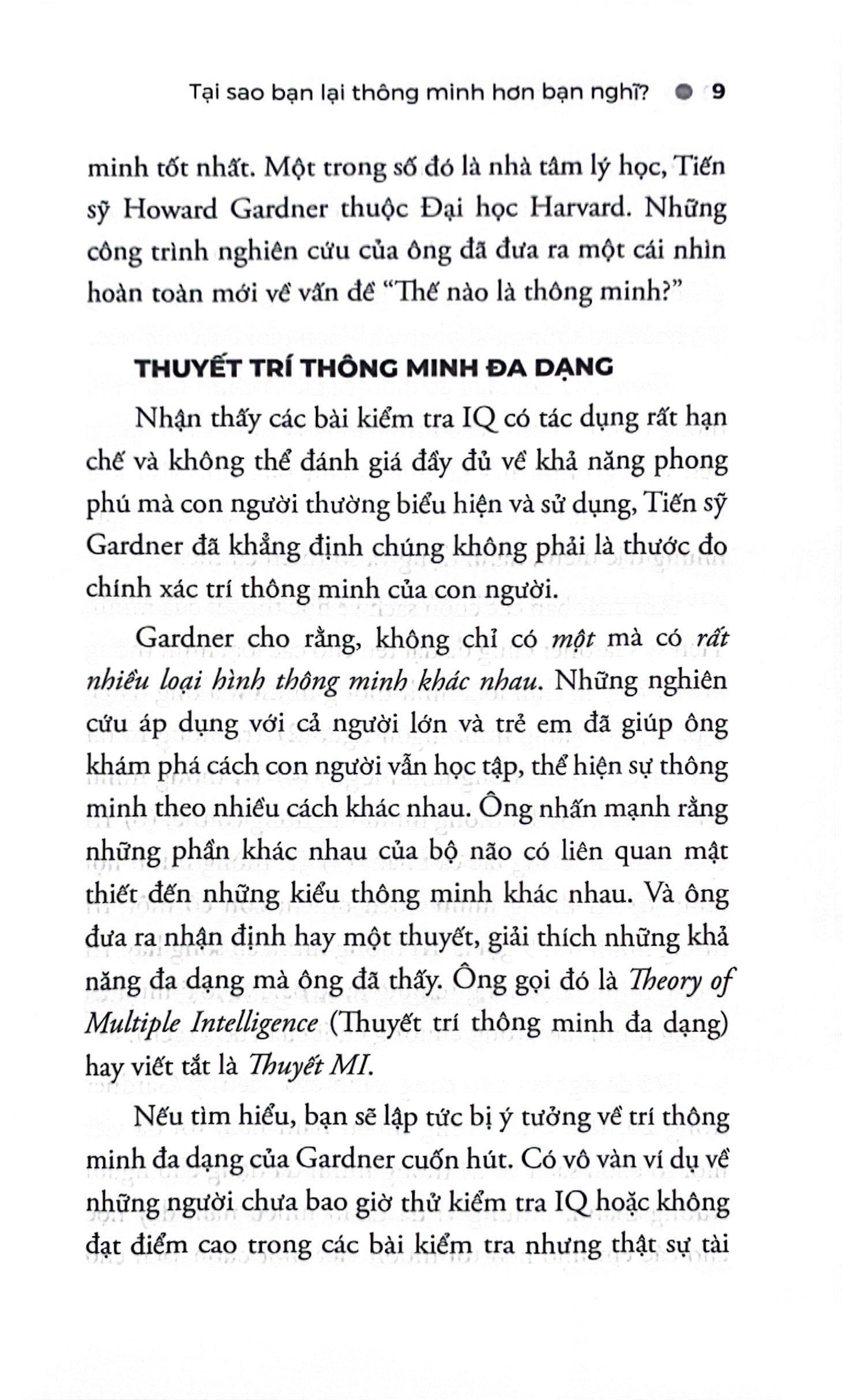 Nhiều người nghĩ rằng kiểm tra chỉ số IQ là cách tốt nhất để đo trí thông minh của con người. Tuy nhiên, kiểm tra IQ không phải là cách hoàn hảo vì có rất nhiều thứ không thể phản ánh qua các bài kiểm tra. Chúng không thể dự đoán được khi trưởng thành bạn sẽ làm gì hoặc trở thành người như thế nào. Và các câu hỏi kiểm tra cũng thường chịu ảnh hưởng bởi định kiến hoặc quan điểm của người ra đề. Bên cạnh đó, không có bài kiểm tra nào là toàn diện. Hệ thống câu hỏi thường không thể làm bộc lộ những khả năng khác nhau của bạn. Nói chung, các bài kiểm tra IQ thường chú trọng từ ngữ hoặc các con số, vì vậy sẽ làm xao lãng những thứ quan trọng khác như khả năng âm nhạc, nghệ thuật, tự nhiên hay xã hội. Thời gian gần đây, nhiều nhà nghiên cứu nghi ngờ quan điểm cho rằng kiểm tra IQ là thước đo trí thông minh tốt nhất. Một trong số đó là nhà tâm lý học, Tiến sỹ Howard Gardner thuộc Đại học Harvard. Những công trình nghiên cứu của ông đã đưa ra một cái nhìn hoàn toàn mới về vấn đề “Thế nào là thông minh?”