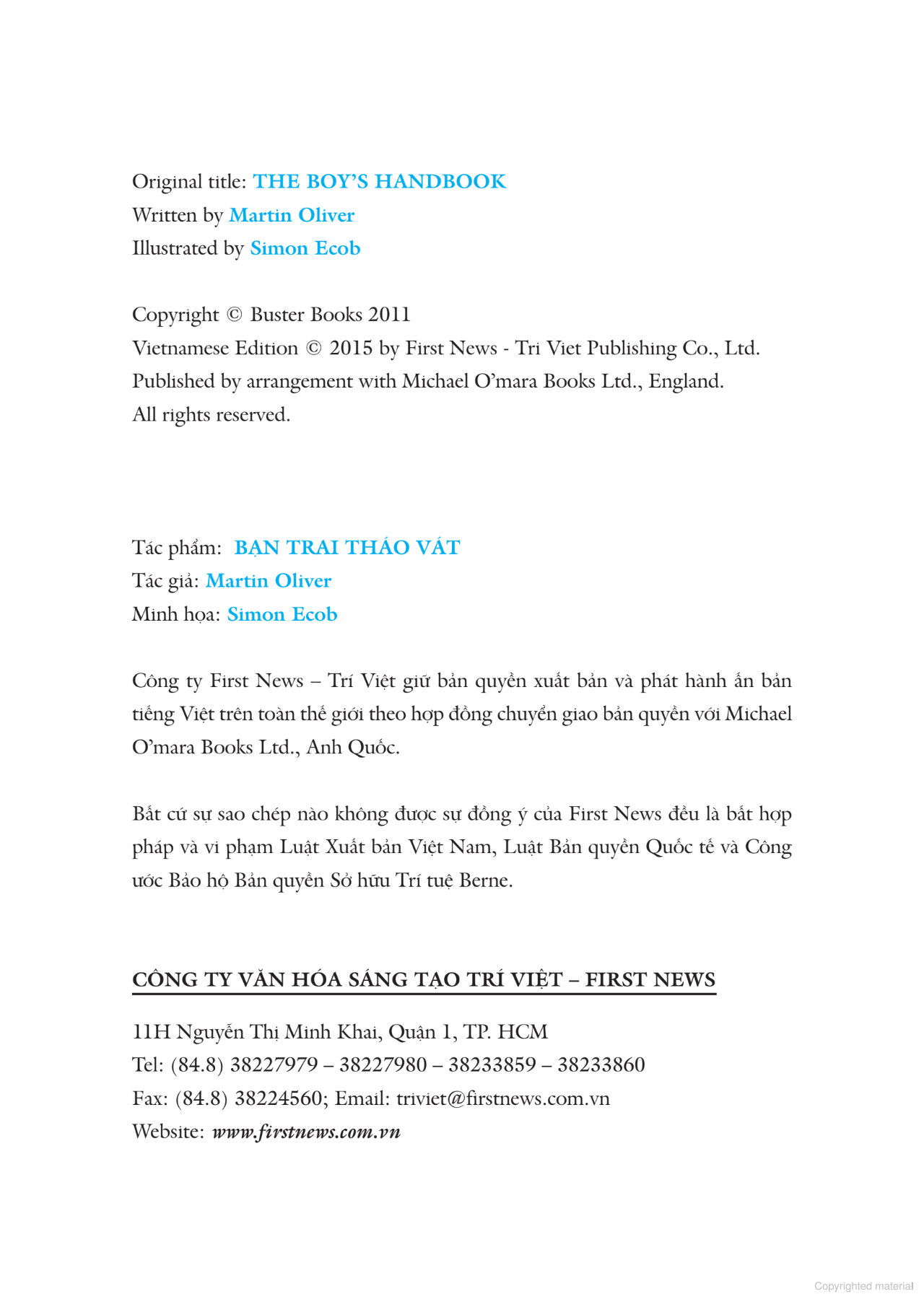 Bạn Trai Tháo Vát (Bộ Tuyệt Chiêu Dành Cho Bạn Trai) Trong cuốn sách này, các bạn trai sẽ tìm thấy nhiều tuyệt chiêu lý thú và hữu dụng trong cuộc sống hiện đại. Từ cách vá bánh xe đạp đến cách tự luộc trứng, đến những kỹ năng xử lý trong những tình huống bị chấn thươ Đây đều là những thông tin mà các bạn trai không nên bỏ qua. Không những thế, đi kèm với từng hướng dẫn là các minh họa cụ thể cùng những lời gợi ý để bạn có thể rèn luyện một cách thành thạo và sáng tạo trong cuộc sống của mình. Hãy đọc cuốn sách này, hãy tự tay chất đầy chiếc túi tháo vát của mình bằng những tuyệt chiêu để giúp chính mình, giúp đỡ bố mẹ, bạn bè và khiến mọi người phải trố mắt vì sự đa năng của mình nhé!