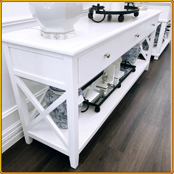 - Phong cách theo xu hướng Hamptons Style, được làm từ gỗ keo sơn trắng