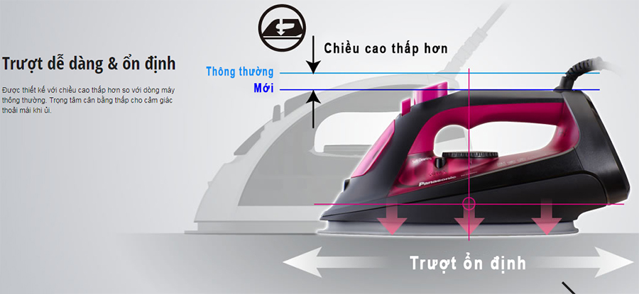 Bàn Ủi Điện Panasonic NI-U400CPRA có thiết kế đẹp mắt, khỏe khoắn cùng màu sắc bắt mắt đem đến cho không gian nhà bạn cảm giác tươi mát. Đặc biệt, sản phẩm còn chú trọng vào tay cầm chắc chắn dễ dàng cầm nắm, trượt đẩy thoải mái nhờ trọng tâm cân bằng thấp.