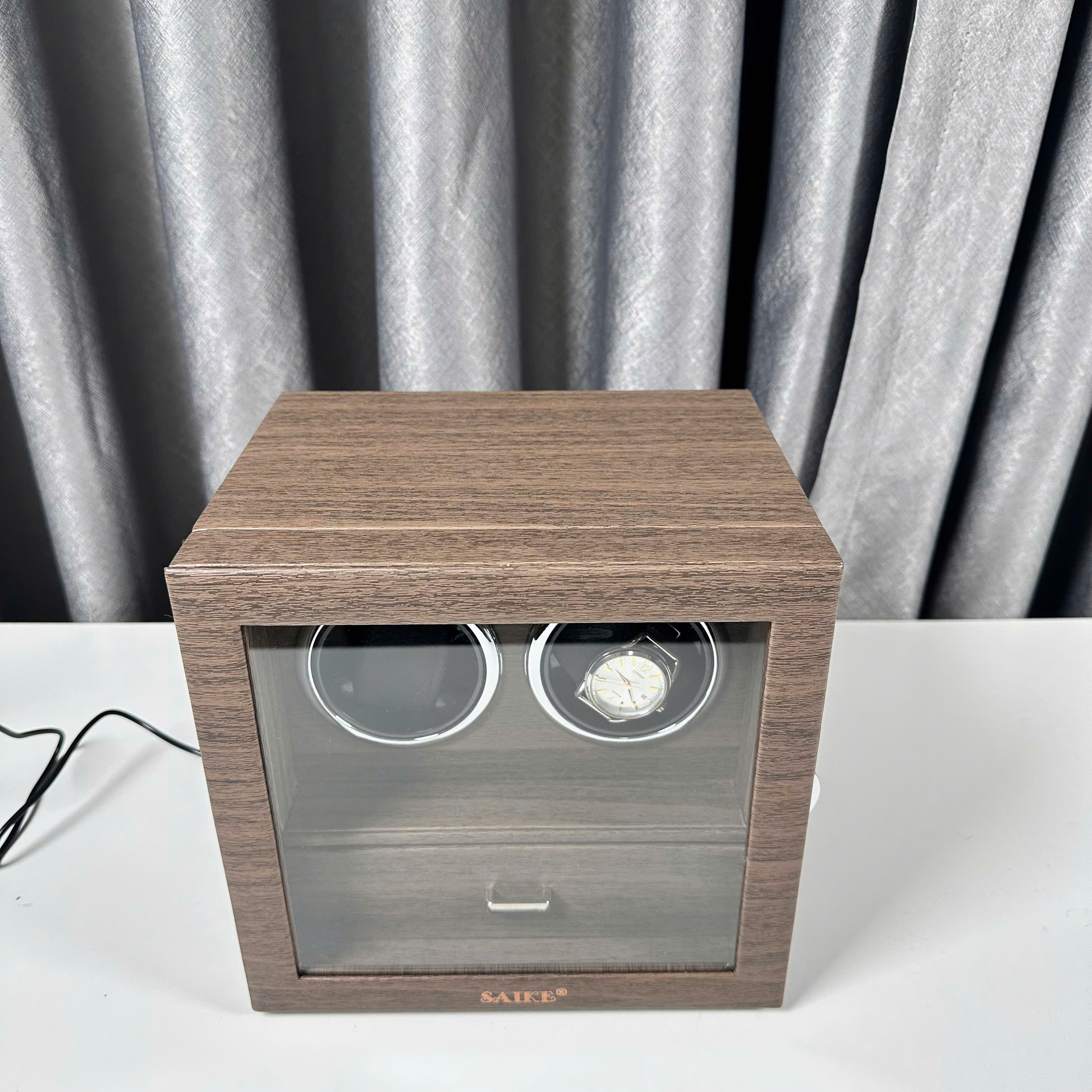 Hộp xoay 2 đồng hồ Saike kèm ngăn đựng trang sức ✿ Chất liệu: Thân gỗ MDF dán veneer vân gỗ tần bì, củ gối bằng mút cao su cao cấp đàn hồi tốt ✿ Thiết kế mới nhất của hãng Saike cuối năm 2024 có cảm biến ánh sáng để tiết kiệm điện và nâng cao tuổi thọ của động cơ. Đóng gói :