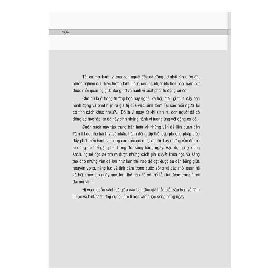 Hi vọng cuốn sách sẽ giúp các bạn độc giả hiểu biết sâu hơn về Tâm lí học và biết cách ứng dụng Tâm lí học vào cuộc sống hằng ngày.