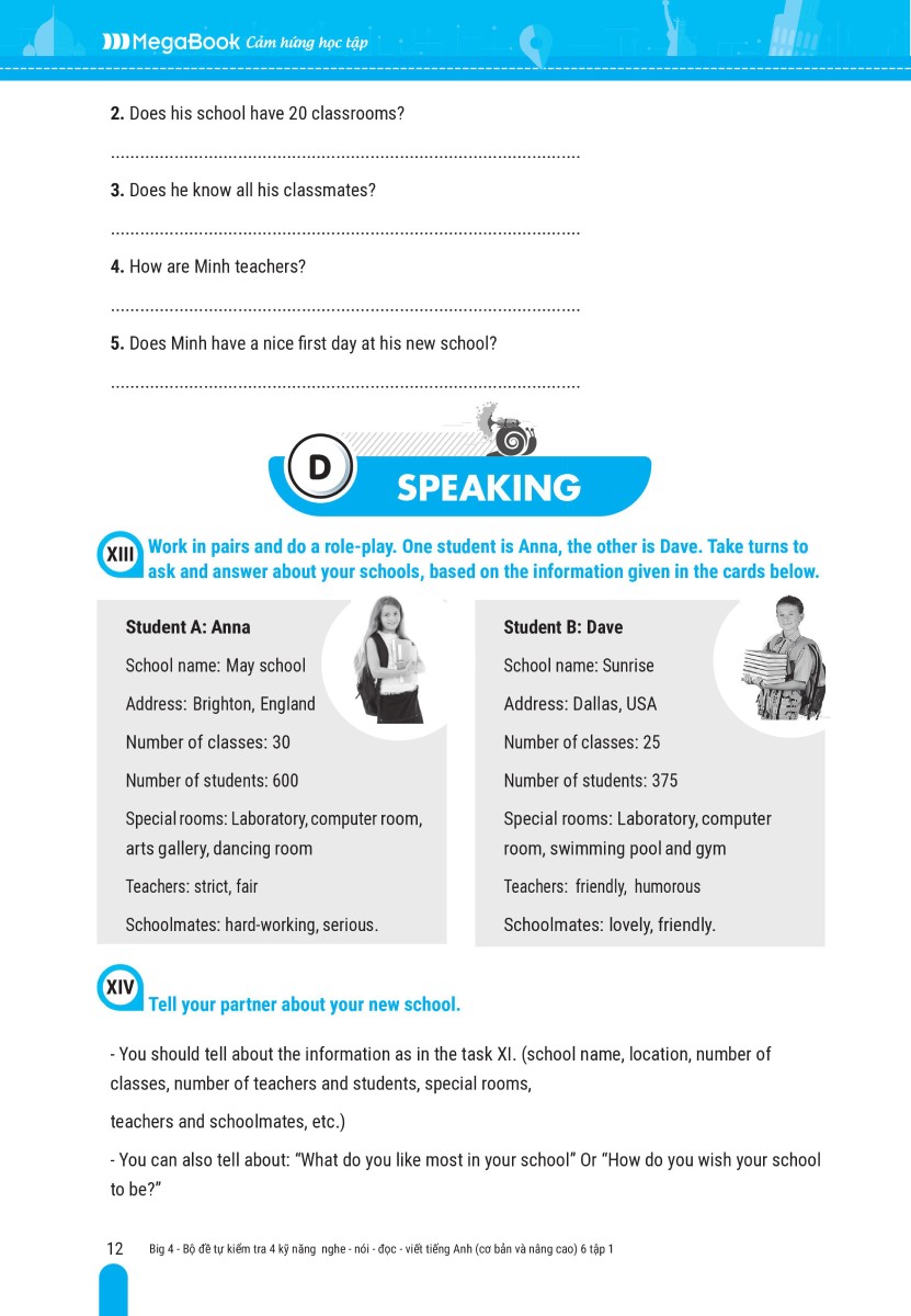 - Nội dung được biên soạn một cách khoa học, theo khung chương trình mới nhất của Bộ Giáo dục và Đào tạo Big 4 - Bộ đề Tự kiểm tra 4 kỹ năng NGHE – NÓI – ĐỌC – VIẾT được biên soạn theo chương trình mới của Bộ Giáo Dục và Đào Tạo. Đây là nguồn tài liệu hữu ích cho giáo viên, phụ huynh và các em học sinh bên cạnh bộ sách giáo khoa cơ bản. Cấu trúc của mỗi Unit gồm 6 phần A. Phonetics B. Vocabulary And Grammar C. Reading D. Speaking E. Listening F. Writing