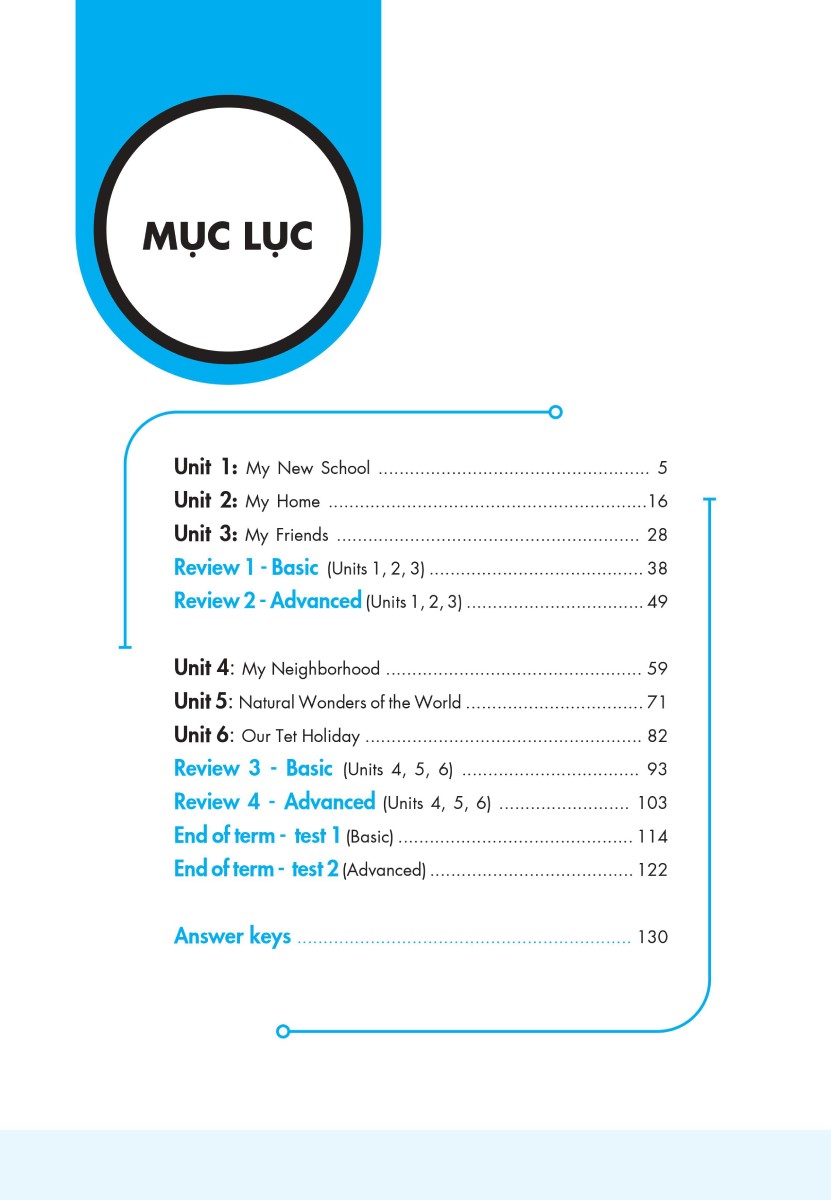 - Bài tập rèn luyện đa dạng, cơ bản và nâng cao Bài tập được phân chia theo 2 cấp độ, cơ bản và nâng cao. Hệ thống bài tập luyện 4 kỹ năng cơ bản giúp các em ôn tập kiến thức trên lớp; bài tập mở rộng, nâng cao để các em rèn luyện và làm quen với các kì kiểm tra, đánh giá. Các bài tập về 4 kỹ năng được liên kết với nhau theo logic bài học giúp cảm em cảm thấy tự tin và phát triển toàn diện kỹ năng nghe, nói, đọc, viết tiếng Anh