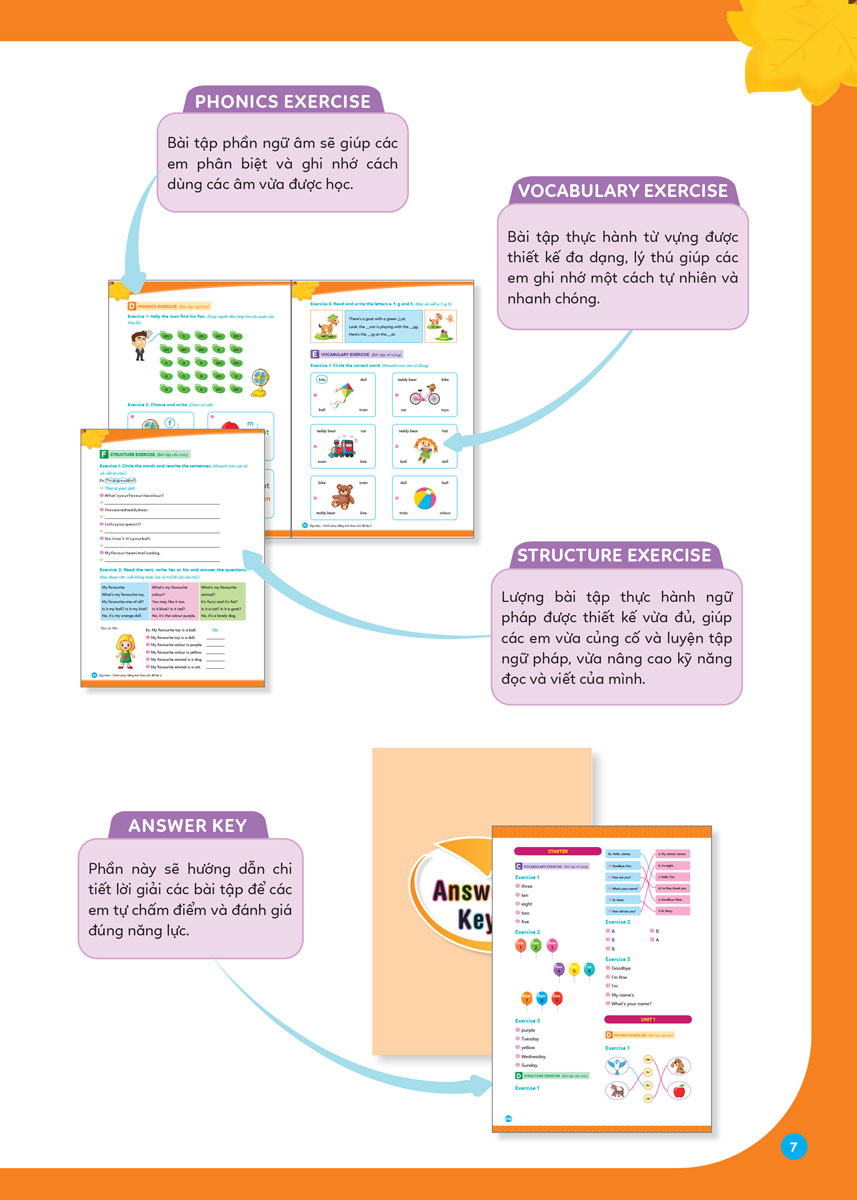 Mỗi cuốn gồm 9 đến 12 chủ đề thân thuộc với các em. Lồng ghép trong mỗi chủ đề chính là các kiến thức và bài tập tiếng Anh, mỗi bài học gồm các phần: