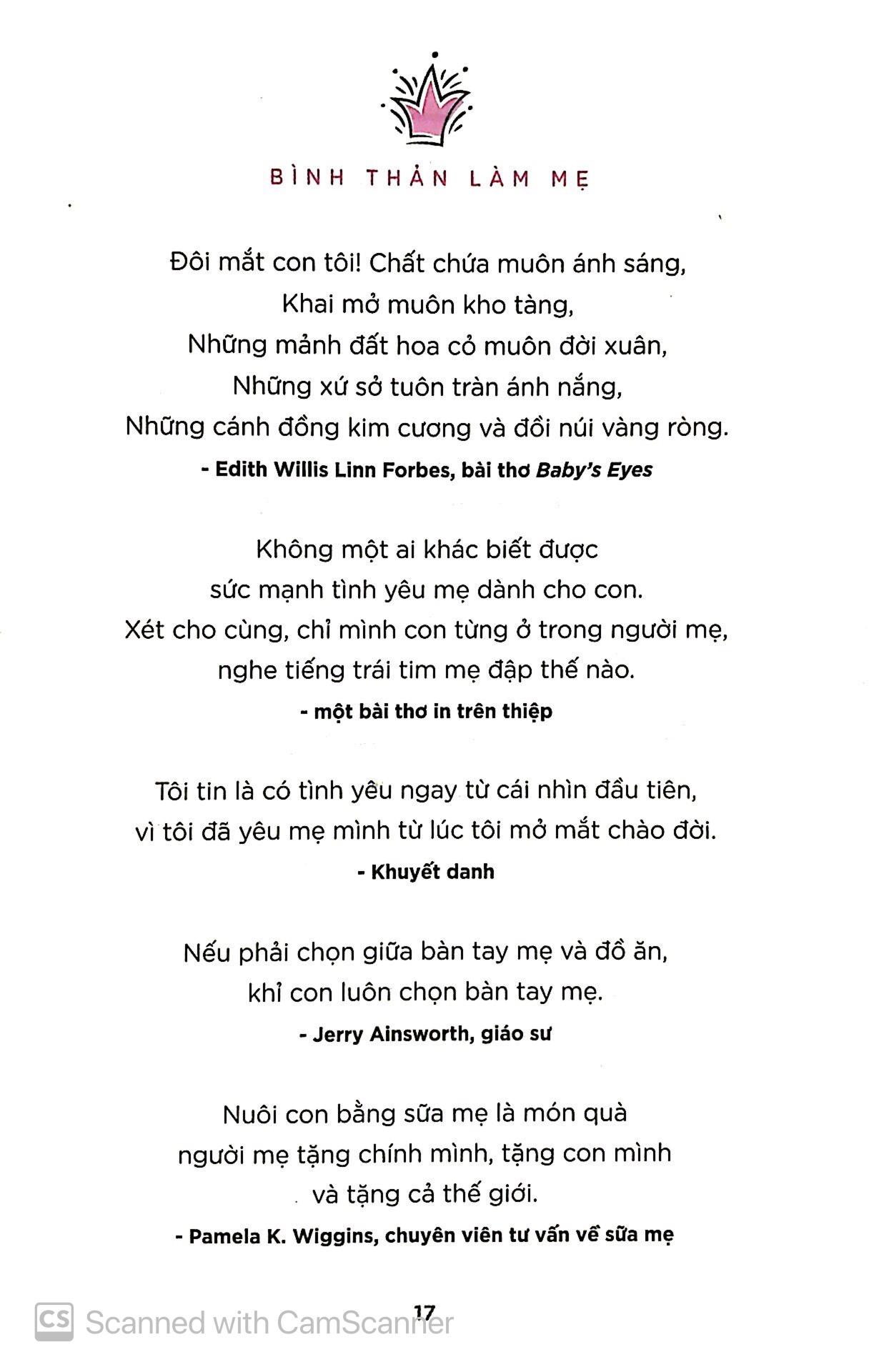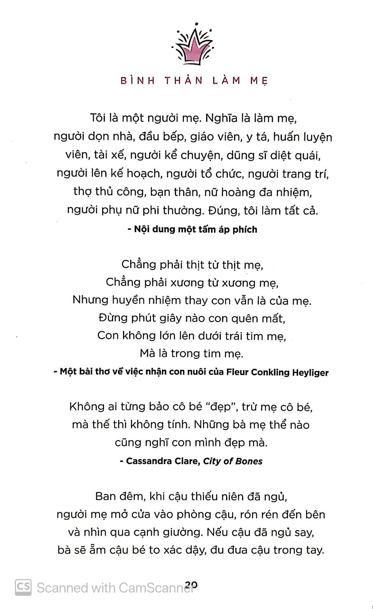Những việc người mẹ làm, dù bé nhỏ hay vĩ đại, cũng đang góp phần thay đổi thế giới! Hãy mở quyển sách này ra để ăn mừng người mẹ, để được sưởi ấm trong tình mẹ con, và được tiếp thêm sức mạnh mà Bình thản làm mẹ .