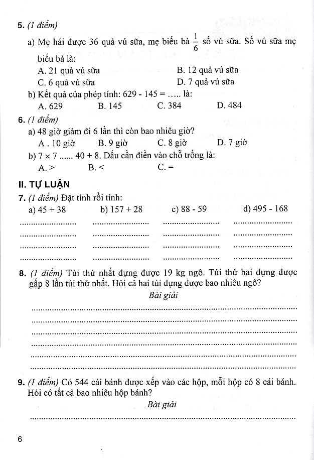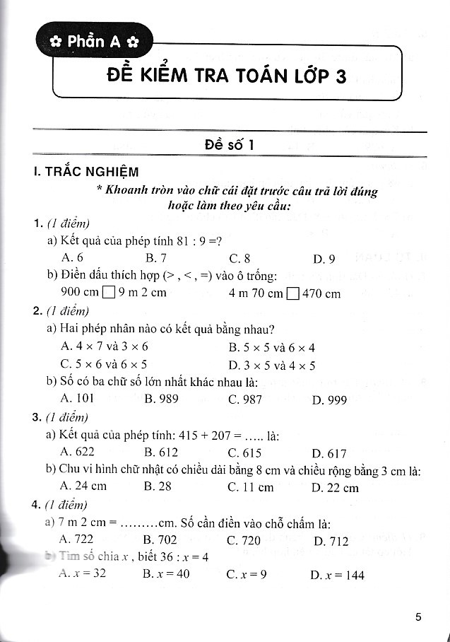 Phần A: Đề kiểm tra toán lớp 3