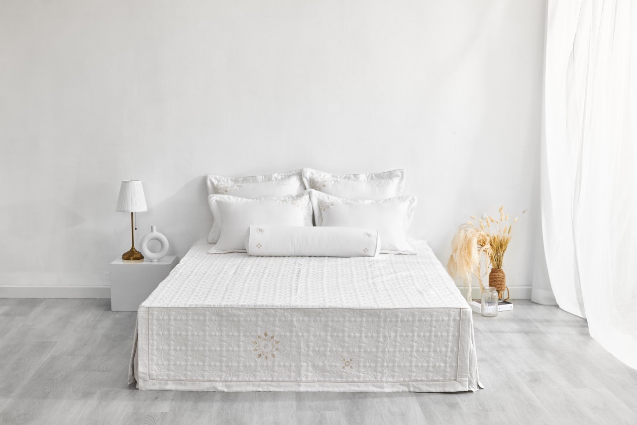 - Bạn sẽ cảm nhận sự mềm mại của loại vải Tencel từ lần chạm đầu tiên, mang đến cảm giác thoáng mát, nhẹ nhàng trong quá trình sử dụng. Những sợi vải mảnh mai được liên kết với nhau một cách chặt chẽ, giúp cho Tencel có độ bền cao gấp 2 lần so với Cotton thông thường. Cũng trên nền trắng là những chùm hoa trắng được thêu tay khá tỉ mẩn và chăm chút, không quá nổi bật nhưng đủ để ánh lên sự thanh lịch và sang trọng cho bộ sản phẩm cũng như không gian chứa đựng nó. Bộ sản phẩm sử dụng vải Tencel làm nguyên liệu hình thành. Bản thân Tencel là loại vải mang đậm dấu ấn của tự nhiên, được chiết xuất từ các loại cây giàu xenlulozo, thân xốp, nhiều sợi như khuynh diệp, bạch đàn, tre… nguyên liệu thành phẩm được xử lý nghiền thành bột và kéo sợi thông qua công nghệ Nano… tạo ra Tencel an toàn tuyệt đối cho sức khỏe người dùng, và thân thiện với môi trường sinh thái. Là màu được sử dụng khá rộng rãi trong thiết kế nội thất của phần lớn các gia đình. Màu trắng là màu của sự giản đơn, có thể phù hợp với nhiều không gian nội thất khác nhau, tạo thành một tổng thể hài hòa và cân đối.