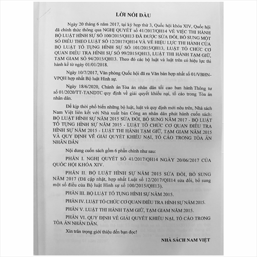 - Toàn bộ sách bìa mềm khổ lớn 19 x 27cm phân phối bởi Nhà sách Nam Việt đều được bọc sách Plastic bằng máy ép nhiệt MIỄN PHÍ và xuất hóa đơn điện tử đầy đủ, nhanh chóng. ...//... Lời giới thiệu: Ngày 20 tháng 6 năm 2017, tại kỳ họp thứ 3, Quốc hội khóa XIV, Quốc hội đã chính thức thông qua NGHỊ QUYẾT số 41/2017/QH14 VỀ VIỆC THI HÀNH BỘ LUẬT HÌNH SỰ SỐ 100/2015/QH13 ĐÃ ĐƯỢC SỬA ĐỔI, BỔ SUNG MỘT SỐ ĐIỀU THEO LUẬT SỐ 12/2017/QH14 VÀ VỀ HIỆU LỰC THI HÀNH CỦA BỘ LUẬT TỐ TỤNG HÌNH SỰ SỐ 101/2015/QH13, LUẬT TỔ CHỨC CƠ QUAN ĐIỀU TRA HÌNH SỰ SỐ 99/2015/QH13, LUẬT THI HÀNH TẠM GIỮ, TẠM GIAM SỐ 94/2015/QH13. Theo đó các bộ luật và luật trên có hiệu lực thi hành kể từ ngày 01/01/2018. Ngày 10/7/2017, Văn phòng Quốc hội đã ra Văn bản hợp nhất số 01/VBHN-VPQH hợp nhất Bộ luật Hình sự. Ngày 18/6/2020, Chánh án Tòa án nhân dân tối cao ban hành Thông tư số 01/2020/TT-TANDTC quy định về giải quyết khiếu nại, tố cáo trong Tòa án nhân dân. Để kịp thời phổ biến những Bộ luật, Luật và quy định mới nêu trên, Nhà sách Nam Việt phối hợp với Nhà xuất bản Công an nhân dân phát hành cuốn sách: Bộ Luật Hình Sự 2015 sửa đổi, bổ sung năm 2017 - Bộ Luật Tố Tụng Hình Sự 2015 - Luật Tổ Chức Cơ Quan Điều Tra Hình Sự - Luật Thi Hành Tạm Giữ, Tạm Giam Năm và Quy Định Về Giải Quyết Khiếu Nại, Tố Cáo Trong Tòa Án Nhân Dân ...//... Nội dung cuốn sách gồm 6 phần chính như sau: PHẦN I. NGHỊ QUYẾT SỐ 41/2017/QH14 NGÀY 20/06/2017 CỦA QUỐC HỘI KHÓA XIV. PHẦN II. BỘ LUẬT HÌNH SỰ NĂM 2015 SỬA ĐỔI, BỔ SUNG NĂM 2017 (Đã cập nhật, hợp nhất Luật số 12/2017/QH14 sửa đổi, bổ sung một số điều của Bộ luật Hình sự số 100/2015/QH13). PHẦN III. BỘ LUẬT TỐ TỤNG HÌNH SỰ NĂM 2015. PHẦN IV. LUẬT TỔ CHỨC CƠ QUAN ĐIỀU TRA HÌNH SỰ NĂM 2015. PHẦN V. LUẬT THI HÀNH TẠM GIỮ, TẠM GIAM NĂM 2015. PHẦN VI. QUY ĐỊNH VỀ GIẢI QUYẾT KHIẾU NẠI, TỐ CÁO TRONG TÒA ÁN NHÂN DÂN. ...//... Cảm ơn các bạn đã ghé thăm shop Nhà sách Nam Việt trên TIKI rất nhiều ạ! Sách Bộ Luật Hình Sự 2015 sửa đổi, bổ sung năm 2017 - Bộ Luật Tố Tụng Hình Sự 2015 - Luật Tổ Chức Cơ Quan Điều Tra Hình Sự - Luật Thi Hành Tạm Giữ, Tạm Giam Năm và Quy Định Về Giải Quyết Khiếu Nại, Tố Cáo Trong Tòa Án Nhân Dân Sách Bộ Luật Hình Sự 2015 sửa đổi, bổ sung năm 2017 - Bộ Luật Tố Tụng Hình Sự 2015 - Luật Tổ Chức Cơ Quan Điều Tra Hình Sự - Luật Thi Hành Tạm Giữ, Tạm Giam Năm và Quy Định Về Giải Quyết Khiếu Nại, Tố Cáo Trong Tòa Án Nhân Dân