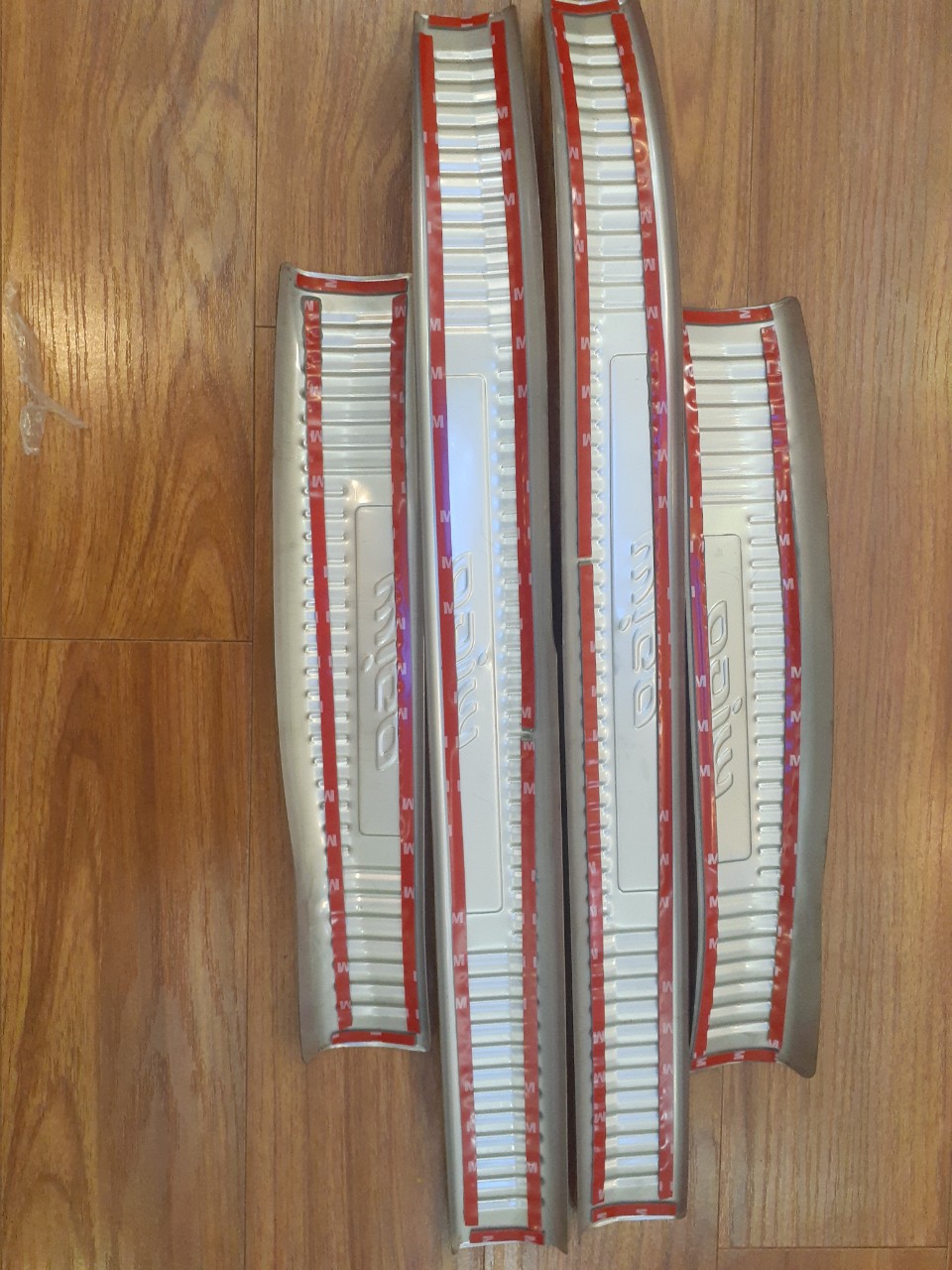 Hướng dẫn lắp Ốp bậc, Nẹp bước chân Toyota Wigo trang trí xe hơi BƯỚC 1 : Ướm thử các chi tiết vào vị trí cần lắp đặt, lấy chi tiết vừa nhất chuẩn nhất và đánh dấu lại ( giúp tránh dán sai, nhầm) BƯỚC 2 : Dùng khăn khô lau thật sạch bề mặt dần dán (Chú ý: Phải dùng khăn khô lau bề mặt không dùng khăn ướt hay khăn có dính dầu mỡ, bụi lau bề mặt sẽ làm xước xe ) BƯỚC 3 : Hơ nóng keo 2 mặt có sẵn ở mặt sau sản phẩm bằng máy sấy tóc hoặc máy lửa BƯỚC 4: Bóc lớp băng keo 2 mặt và chuẩn bị lắp ráp BƯỚC 5: Đặt sản phẩm lên vị trí cần dán và thực hiện dán ( Đặt nhẹ từ đầu trên xuống đầu dưới khi đã cảm thấy sản phẩm đúng vị trí mới dùng lực ép vào bề mặt cần lắp đặt )
