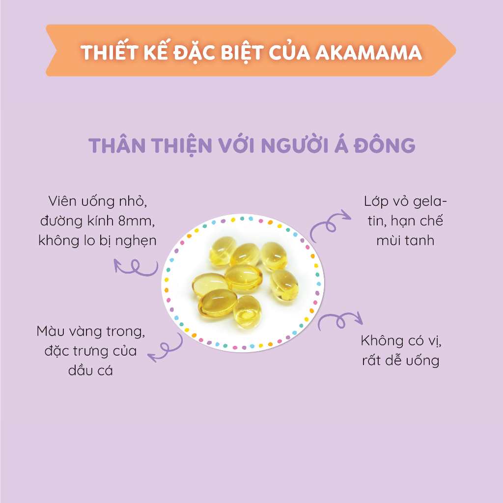- Bổ sung đầy đủ Vitamin E giúp tăng độ đàn hồi da, hạn chế các vết rạn khi mang thai ở mẹ bầu. Viên uống không mùi, không vị Sản phẩm có dạng viên dạng viên uống nhỏ, có đường kính chỉ 8mm giúp mẹ bầu không bị nghẹn khi uống. Đặc biệt, lớp vỏ gelatin không vị giúp hạn chế mùi tanh, dễ uống đối với phụ nữ mang thai trong thời kỳ ốm nghén. Tại sao mẹ bầu nên chọn Akamama? DHA và EPA: Đây là hai thành phần chính trong Akamama, giúp: Phát triển não bộ: DHA là thành phần cấu tạo nên màng tế bào thần kinh, giúp tăng cường khả năng học tập và ghi nhớ của bé sau này. Phát triển thị giác: EPA hỗ trợ sự phát triển của võng mạc, giúp bé có đôi mắt sáng khỏe. Giảm nguy cơ sinh non: DHA và EPA giúp củng cố màng tế bào, giảm nguy cơ sinh non. Hỗ trợ sức khỏe tim mạch cho mẹ: Giúp giảm cholesterol xấu, ngăn ngừa các bệnh tim mạch. Thành phần tự nhiên: Akamama được sản xuất từ các nguyên liệu tự nhiên, an toàn cho cả mẹ và bé. Tiện lợi: Dạng viên nang mềm, dễ uống, thuận tiện cho mẹ bầu sử dụng hàng ngày. Hướng dẫn sử dụng