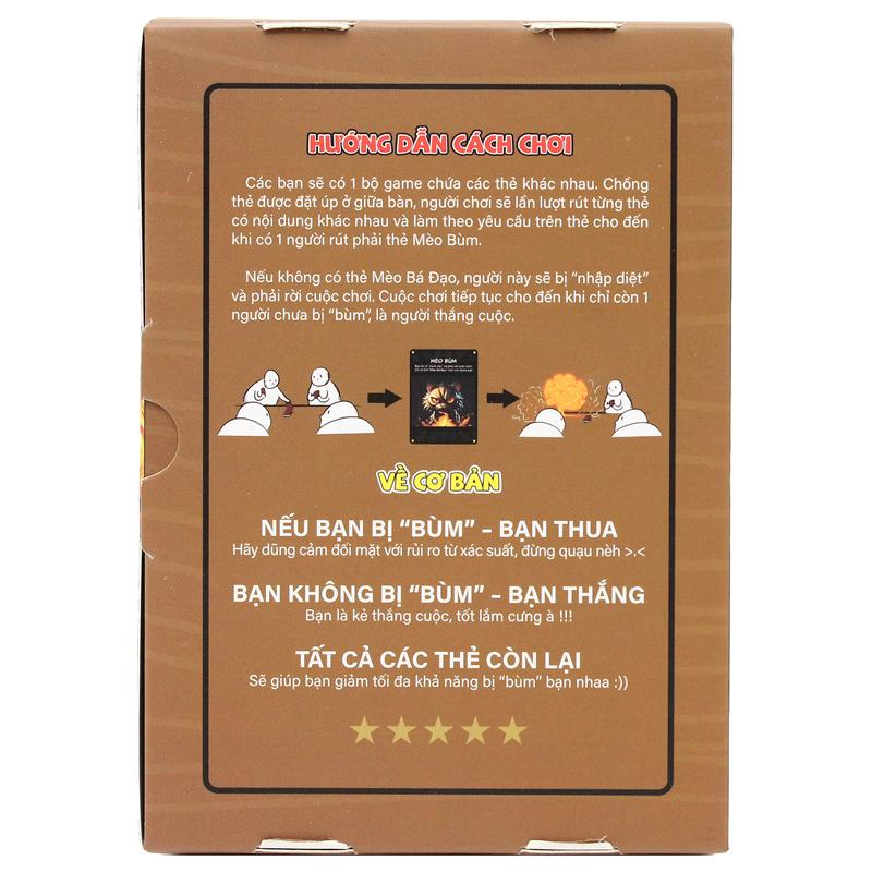 Boardgame Mèo Bùm - Liên Hiệp Thành Hướng dẫn cách chơi: Các bạn sẽ có 1 bộ game chứa các thẻ khác nhau. Chồng thẻ được đặt úp ở giữa bàn, người chơi sẽ lần lượt rút từng thẻ có nội dung khác nhau và làm theo yêu cầu trên thẻ cho đến khi có 1 người rút phải thẻ Mèo Bùm. Nếu không có thẻ Mèo Bá Đạo, người này sẽ bị “nhập diệt” và phải rời cuộc chơi. Cuộc chơi tiếp tục cho đến khi chỉ còn 1 người chưa bị “bùm” là người thắng cuộc. Về Cổ Bảo NẾU BẠN BỊ “BÙM” – BẠN THUA Hãy dũng cảm đối mặt với rủi ro từ xác suất, đừng quạu nèh >.< BẠN KHÔNG BỊ “BÙM” – BẠN THẮNG Bạn là kẻ thắng cuộc, tốt lắm cưng à !!! TẤT CẢ CÁC THẺ CÒN LẠI Sẽ giúp bạn giảm tối đa khả năng bị “bùm” bạn nhaa :))