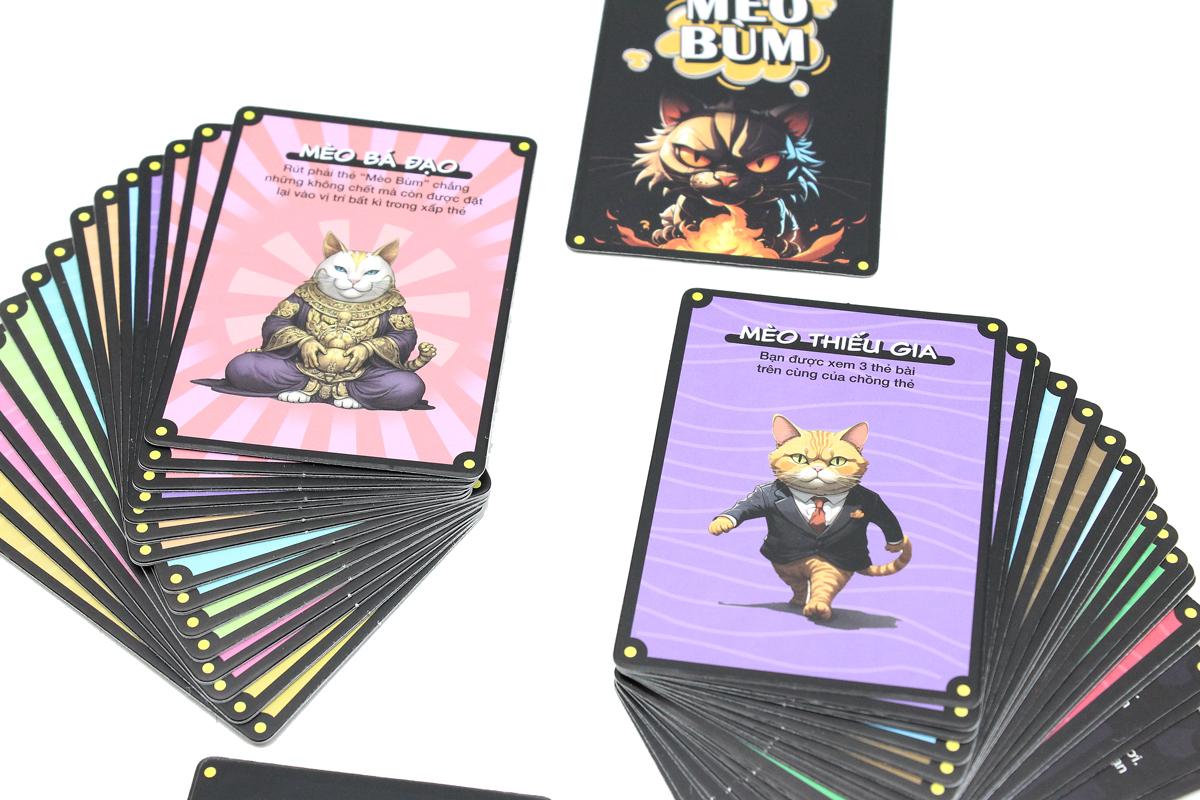 Boardgame Mèo Bùm - Liên Hiệp Thành Hướng dẫn cách chơi: Các bạn sẽ có 1 bộ game chứa các thẻ khác nhau. Chồng thẻ được đặt úp ở giữa bàn, người chơi sẽ lần