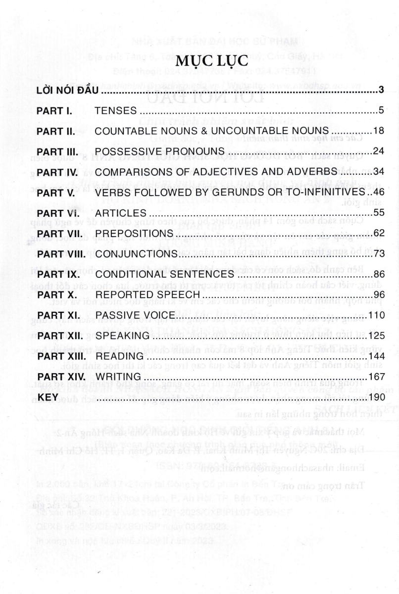 Cuốn sách bao gồm 14 phần, được bố cục theo từng chuyên đề về ngữ pháp nhằm giúp các em ôn tập và củng cố những kiến thức ngữ pháp đã học, đồng thời bổ sung thêm nhiều dạng bài tập nâng cao để các em luyện tập và trau dồi.