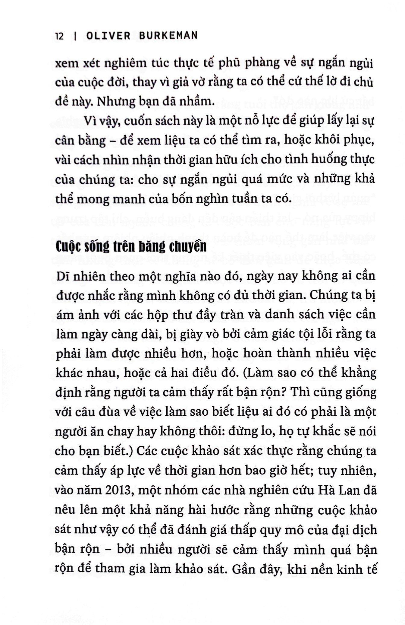Lẽ tất nhiên, không ai thích nghe bảo rằng m.ình có ít thời gian đến thế nào. Người ta tìm cách làm nhanh hơn, nhiều hơn, nhồi nhét thêm việc vào một lượng thời gian không thể giãn nở. Họ quay cuồng với khao khát được làm chủ cuộc sống của m.ình… nếu không phải hôm nay, thì là vào một ngày nào đó trong tương lai.