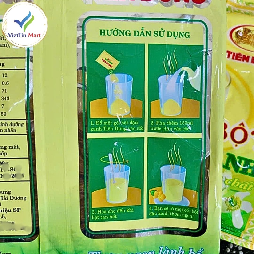 THÔNG TIN SẢN PHẨM Tên sản phẩm: Bột Đậu Xanh Tiên Dung 500g (10 gói x 50g) Thành Phần: Bột đậu xanh nguyên chất, đường kính, hương liệu (vani), đường glucose. Thương hiệu: VietTinMart Khối lượng: 500g Quy cách đóng gói : Sản phẩm được đóng túi Ngày Sản Xuất: in trên bao bì Hạn sử dụng: 12 tháng. Hướng dẫn bảo quản: Nơi khô ráo, thoáng mát. Tránh ánh nắng mặt trời trực tiếp Hướng dẫn sử dụng: