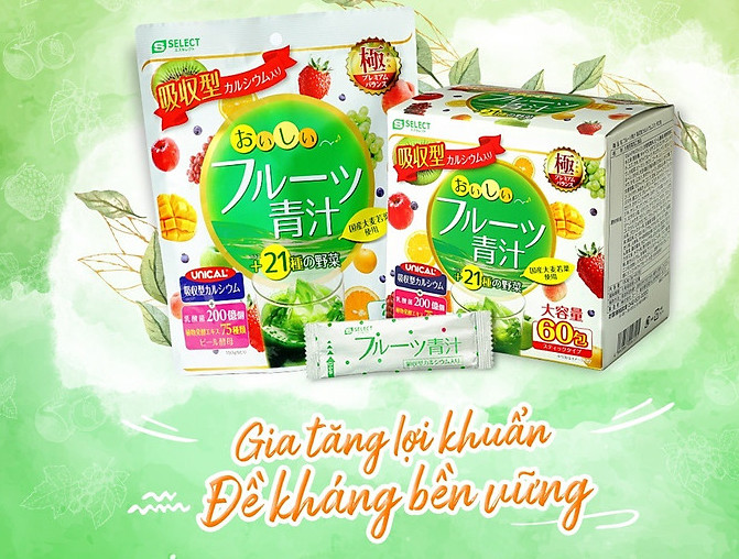Bột lá đại mạch non, rau xanh và trái cây S Select Nhật Bản ( hộp 60 gói) giúp bổ sung chất xơ, vitamin từ 21 loại rau củ quả và chiết xuất của 75