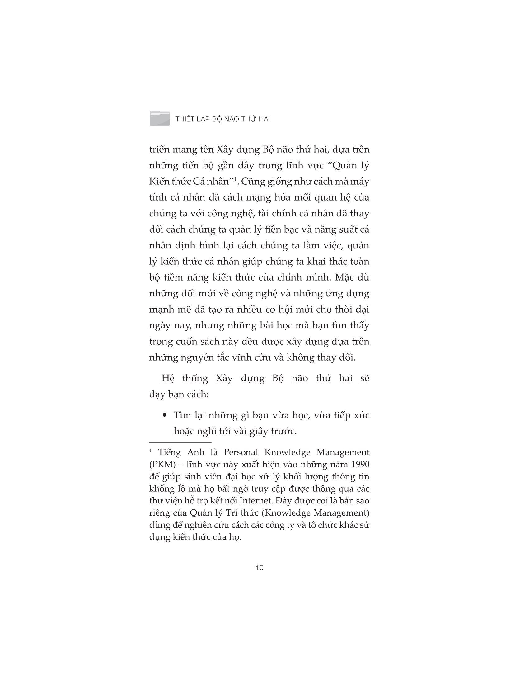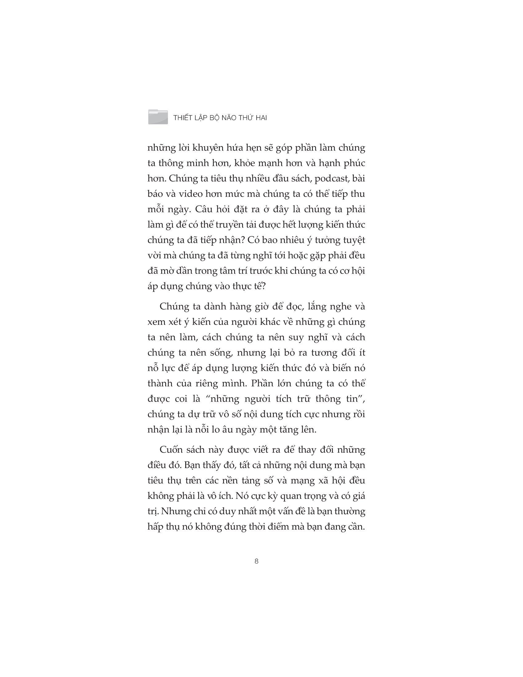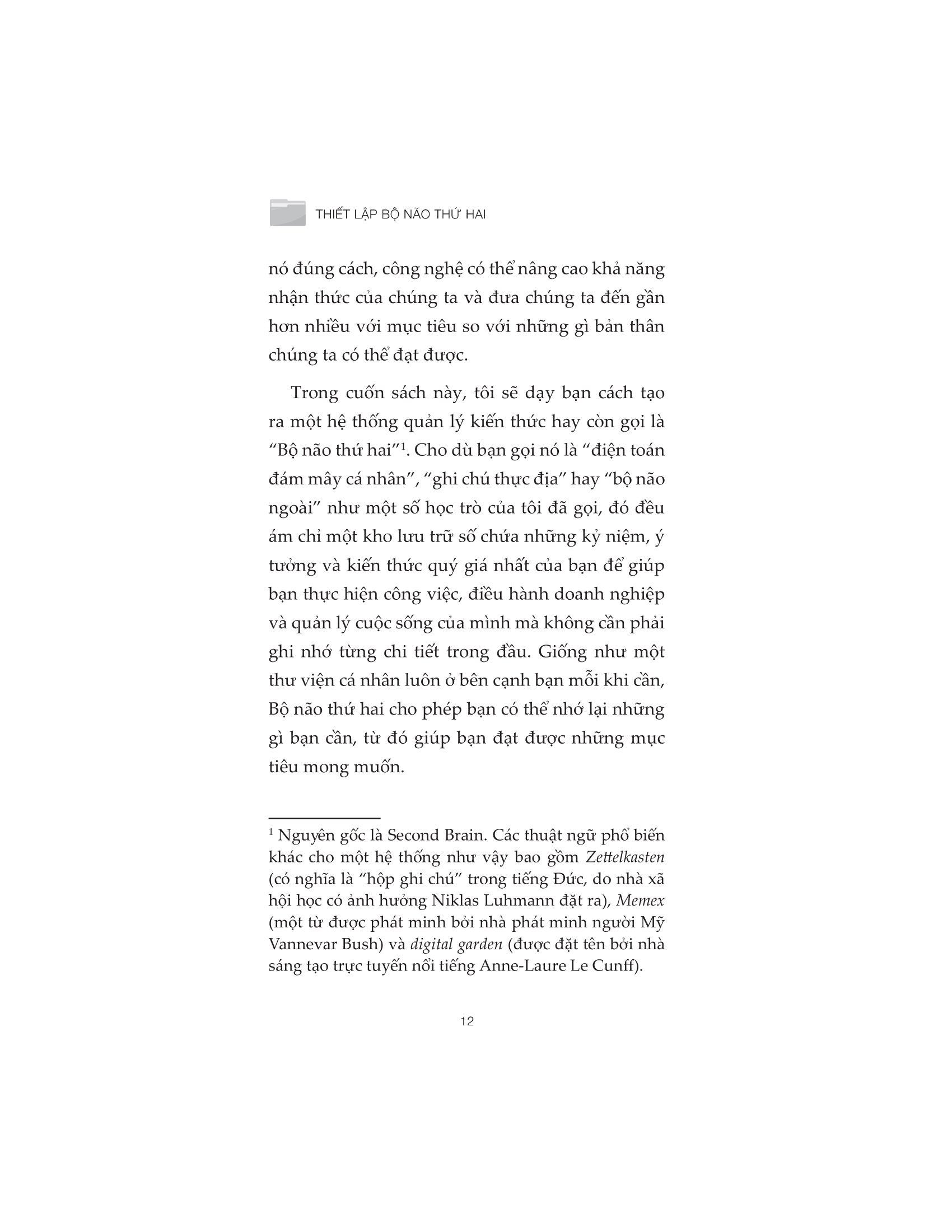 Cuốn sách Buiding a Second Brain - Thiết lập bộ não thứ hai làmột cách tiếp cận mang tính cách mạng, một bản hướng dẫn, chỉ ra các phương pháp để bạn có thể dễ dàng tạo hệ thống dữ liệu công việc cá nhân để quản lý kiến thức. Hệ thống này chính là kho lưu trữ kỹ thuật số có tổ chức và đáng tin cậy, chứa các ý tưởng, ghi chú sáng tạo có giá trị nhất, được đồng bộ hóa trên tất cả các thiết bị và nền tảng của bạn. Bộ não thứ hai mang đến cho bạn sự tự tin để giải quyết các dự án quan trọng nhất và các mục tiêu đầy tham vọng của m.ình.