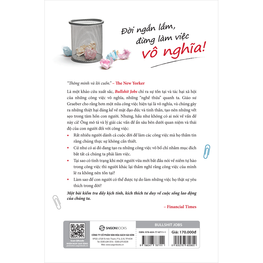 Là một khảo cứu xuất sắc, Bullshit Jobs: Đời ngắn lắm, đừng làm việc vô nghĩa! chỉ ra sự tồn tại và tác hại xã hội của những công việc vô nghĩa, những “nghề thừa” quanh ta. Giáo sư David Graeber cho rằng hơn một nửa công việc hiện tại là vô nghĩa, và chúng gây ra những thiệt hại đáng kể về mặt đạo đức và tinh thần, tạo nên những vết sẹo trong tâm hồn con người.